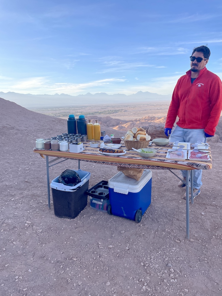 Der Tag beginnt früh. Um 7:30 Uhr werde ich zu meiner Tour abgeholt. Wir fahren zur Baltinache-Lagune. Doch zuerst machen wir einen Stopp fürs Frühstück. An einem wunderschönen Aussichtspunkt baut unser Guide Francesco ein wundervolles Frühstücksbuffet auf. Von Avocado, Rührei, Toast, Obst, Saft und Kaffee. Alles ist da und die Aussicht auf das Moon Valley ist fantastisch. Nach der gemütlichen Stärkung fahren wir weiter. Am Gate müssen wir noch auf die Ranger warten. Nach und nach rollen mehr Vans an. Dann kommen die Ranger. Nun warten alle, die gerade noch vor dem Gate gewartet haben, am Schalter, um ihre Eintrittskarten zu bezahlen. Zum Glück ist unsere Gruppe als Zweite dran, denn das System ist nicht das schnellste. Allerdings, man beachte, nur Kartenzahlung möglich!