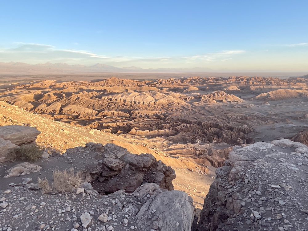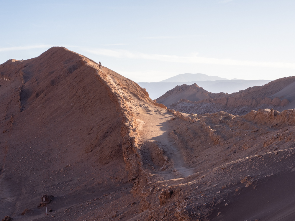 Am Nachmittag bleibt noch etwas Zeit zum Ausruhen im Hostel. Dann geht schon die nächste Tour los: Um halb vier werde ich abgeholt und wir fahren zum Valle de la Luna. Das Mondtal gilt als eine der bekanntesten Sehenswürdigkeiten um San Pedro und liegt auch nur wenige Autominuten von der Stadt entfernt. Die schroffe und trockene Landschaft erinnerte den Entdecker an den Mond und er nannte die Gegend daher kurzerhand Mondtal. Eigentlich müsste es jedoch eher Marstal heißen, denn mit dem roten Sandstein ähnelt das Tal doch eher unserem roten Nachbarplaneten. Sogar so stark, dass die NASA ihre Mars-Rover genau hier, im Valle de la Luna, testet. Wir fahren zur Salzformation der Tres Marias, besuchen ein altes Haus der Minenarbeiter, die hier Salz abgebaut haben, und wandern anschließend auf die große Düne, von der man einen wunderbaren Ausblick auf die Umgebung hat. Zum Sonnenuntergang fahren wir zu einem Aussichtspunkt oberhalb des Tals und können auf die zerklüfteten Felsformationen herabschauen. Ein sehr gelungener erster Tag in der Atacamawüste.
