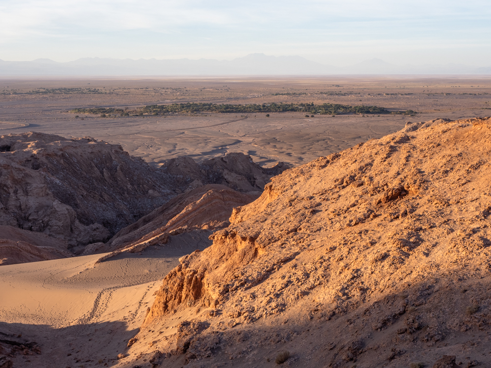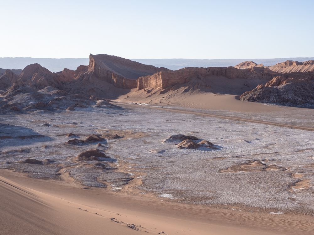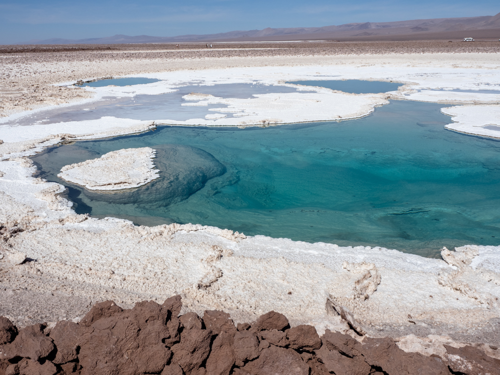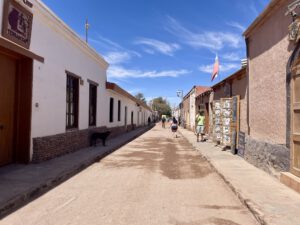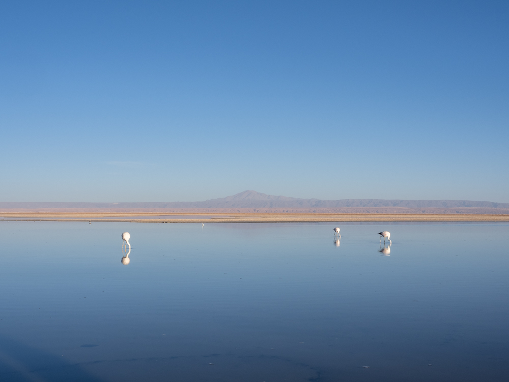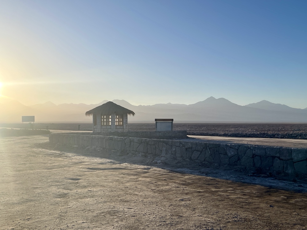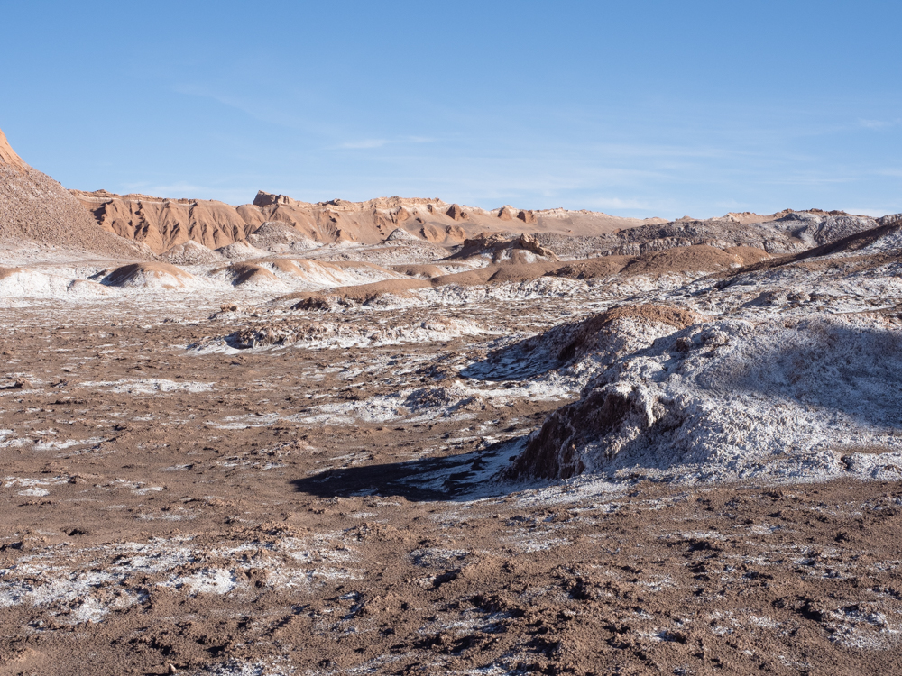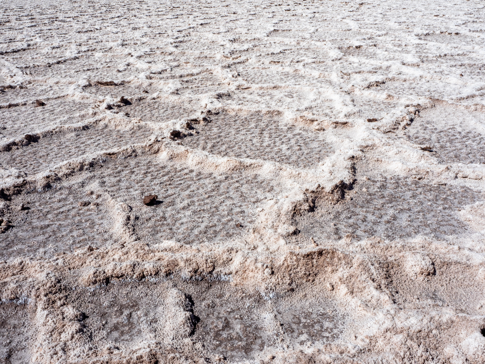 Nachdem ich in meinem Hostel eingecheckt habe, gehe ich auf einen ersten Stadtbummel. San Pedro besteht überwiegend aus Unterkünften, Restaurants, Souvenirläden und Touranbietern und ist sehr touristisch, hat aber auch seinen Charme und sieht mit den vielen Lehmhäusern noch recht traditionell aus. Wir befinden uns bereits auf über 2400m über dem Meeresspiegel, die Anden um uns herum erheben sich auf über 5000m. Nicht weit entfernt liegt das ALMA, das Atacama Large Millimeter Array, ein riesiges Radioteleskop-Observatorium. Aufgrund der Höhe, der klaren Luft, wenig Lichtverschmutzung und überwiegend wolkenfreier Bedingungen gilt die Atacamawüste als einer der besten Orte, um das Universum zu beobachten. Für die nächsten Tage habe ich auch noch eine Stargazing-Tour geplant, doch zunächst richte ich meinen Blick auf den salzhaltigen Boden.
