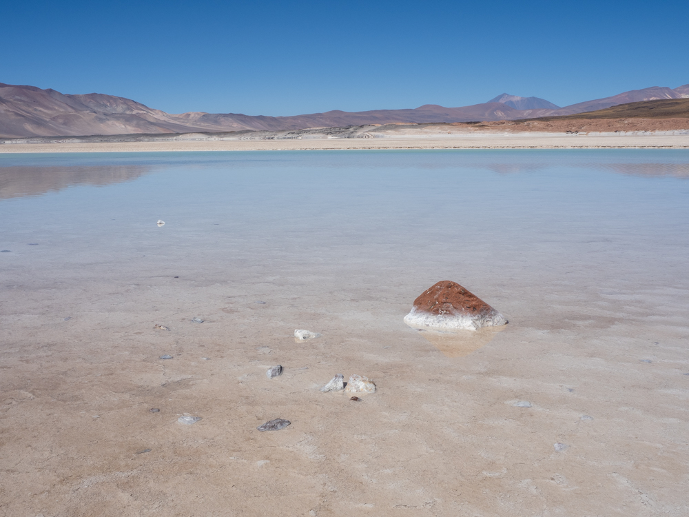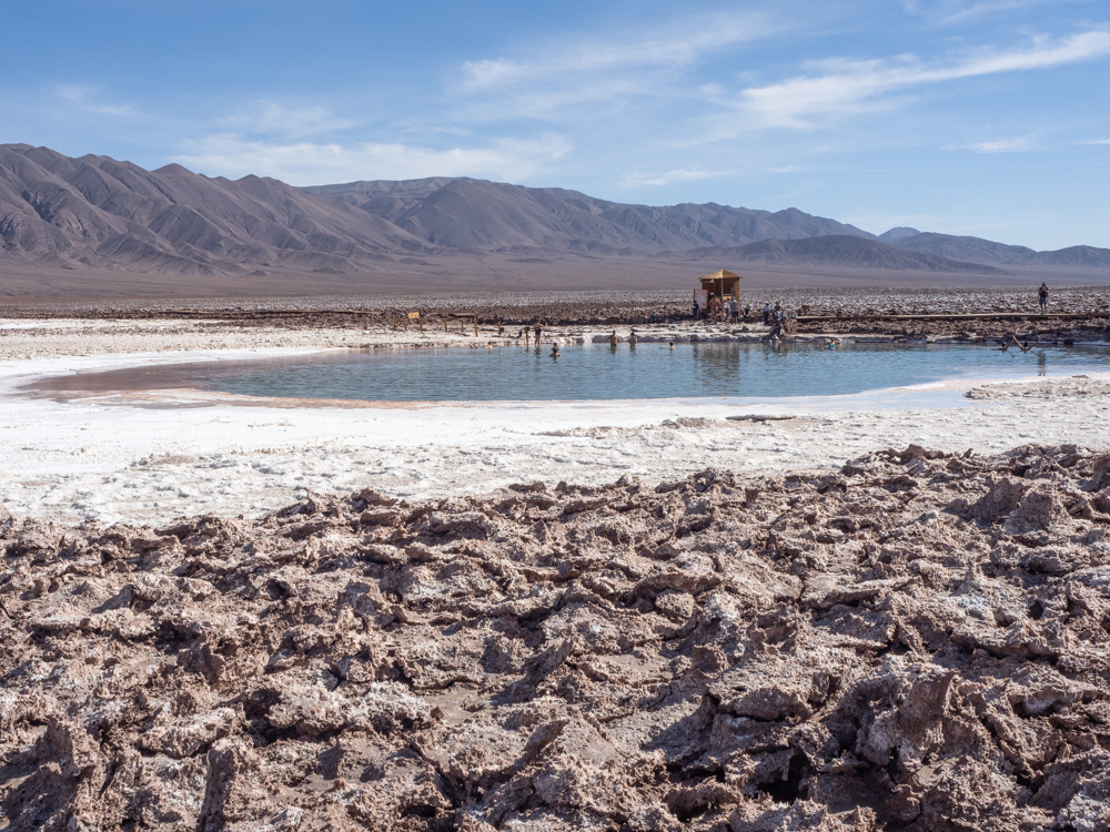 Wir bekommen Bademäntel und laufen über einen Holzplankenweg zur Lagune. So weit das Auge reicht ist der Boden von Salz bedeckt und hält Sand und Geröll in groben Blöcken zusammen. Dann tut sich auf einmal die Lagune vor uns auf. Das Wasser schimmert türkisblau und wir können die mit Salz bedeckten Wände im klaren Wasser erkennen. Die Lagune wird unterirdisch gespeist und ist wie alles hier sehr salzig. Das Schwimmen erinnert etwas ans Tote Meer, denn man treibt eher, anstatt zu schwimmen. Es ist eine lustige Erfahrung, lässt mich aber auch etwas nachdenklich zurück. Die Lagune wurde erst vor drei Wochen wieder fürs Baden geöffnet. Davor war das Betreten der Lagune für über ein Jahr verboten, um dem Wasser die Möglichkeit zu geben, sich zu regenerieren. Denn mit jedem Badegang bleiben Hautpartikel, Schmutz, Sonnencreme und Schweiß im Wasser zurück und machen es milchig. Wir kommen später noch an einer anderen Lagune vorbei, die nicht zum Baden freigegeben ist, und die ist wirklich unglaublich klar. Im Vergleich dazu ist „unsere“ Lagune bereits nach drei Wochen deutlich verschmutzt. Ich will mir nicht vorstellen, wie das nach mehreren Monaten aussieht. Doch um weiterhin Touristen anzuziehen, möchte man aufs Baden nicht komplett verzichten und nun sind zwei Lagunen jeweils im Wechsel geöffnet. Heutzutage tun sich jedoch auch ganz neue Schwierigkeiten auf. Das Land, auf dem die Lagunen liegen, gehört zwei indigenen Familien. Sie machen die Lagunen für Touristen zugänglich. Doch mittlerweile hat man Lithium im Boden entdeckt und der Verkauf an die Minenfirma wäre ein lukratives Geschäft. Francisco befürchtet, dass es die Lagunen bald gar nicht mehr gibt. So nimmt der Kapitalismus auch in der weit entlegenen Atacamawüste seinen Lauf.
