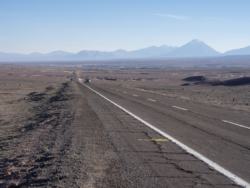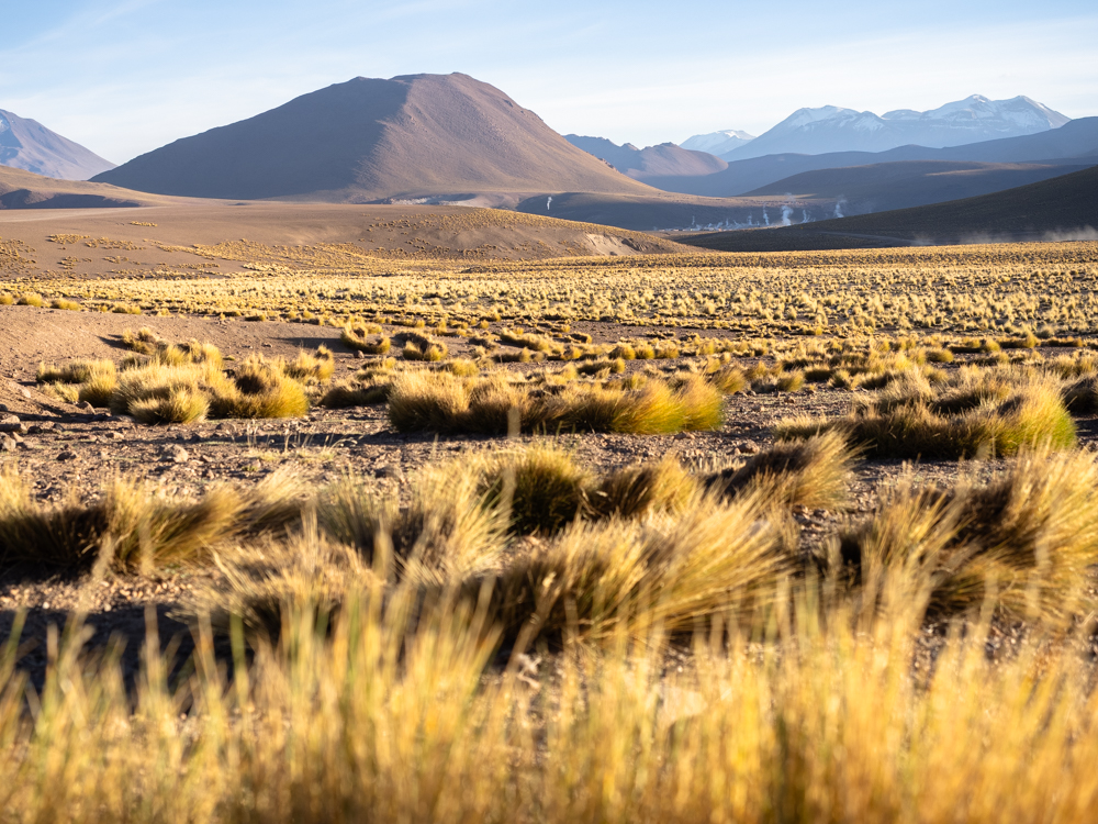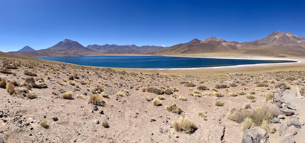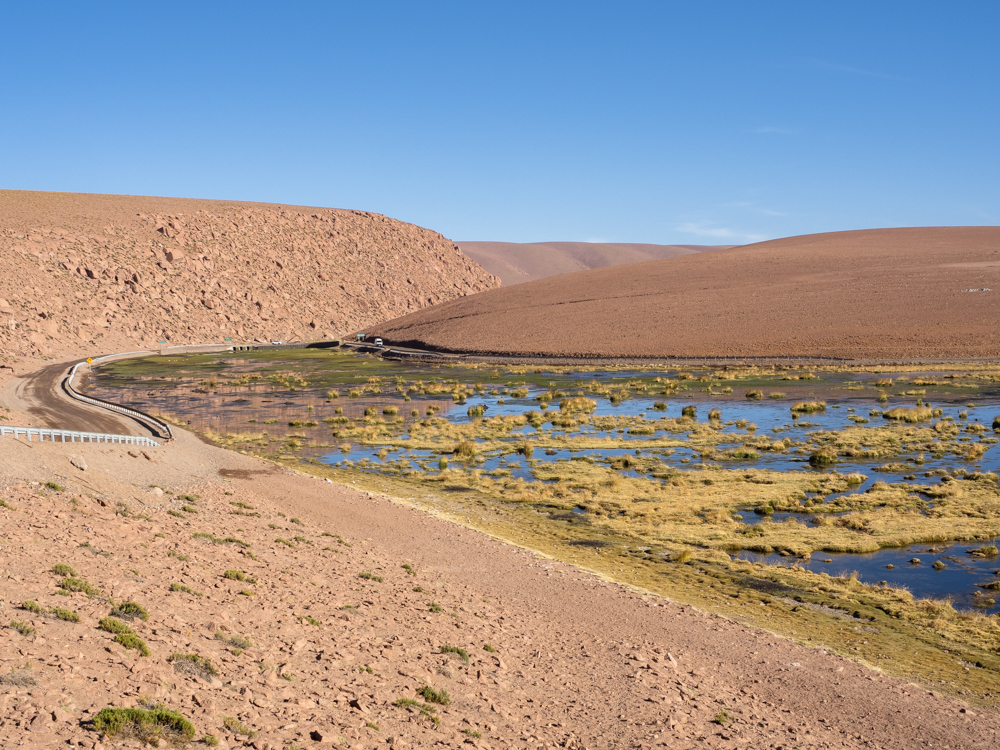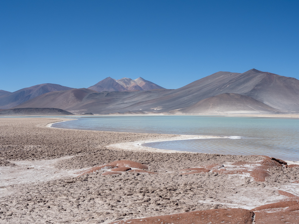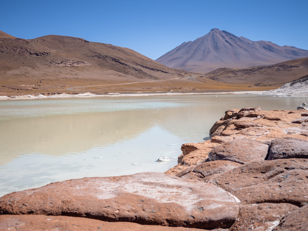 Auch der nächste Tag beginnt früh. Um 6:30 Uhr startet die heutige Tour mit Sarah. Zunächst fahren wir zur Chaxa-Lagune. Wir sind früh dran und haben noch Zeit für ein Frühstück mit Blick auf die Lagune und die Anden hinter uns, bevor die Ranger kommen und das Tor öffnen. Wir spazieren umher und beobachten die Flamingos, die die Lagune ihr Zuhause nennen. Sarah erklärt uns viel über die hier vorkommenden Arten und die Verhaltensweisen. Dann fahren wir weiter, erst über Schotter, dann wieder auf einer Asphaltstraße. Doch es dauert nicht lange und wir werden ausgebremst. Wir haben einen Platten. Kein Problem, unser Fahrer kennt sich aus und beginnt sofort, den Reifen zu wechseln. Doch leider funktioniert unser Wagenheber nicht. Wir können ein anderes Fahrzeug anhalten und uns ihren Wagenheber ausleihen. Mit neuem Reifen geht es dann weiter. Im Dorf Socaire machen wir kurz Pause. Socaire liegt bereits auf über 3300m Höhe und das Atmen fällt schon deutlich schwerer. Doch heute geht es noch höher hinaus. Wir steuern die Piedras Rojas an, die roten Steine, auf 4200 m über dem Meeresspiegel. Nicht weit entfernt ist die Grenze zu Argentinien. Wir gehen ein paar Hundert Meter zum Aussichtspunkt und überblicken die Lagune, das rote Vulkangestein und die Vulkane Aguas Calientes und Lascar. Nicht nur die wunderschöne Landschaft lässt uns atemlos zurück. Auch der kurze Aufstieg zurück zum Auto hat es in sich. Ruhig und bewusst atmen, rät Sarah. Noch kurz bleiben wir auf dieser Höhe. Wir wollen weiter zu den Lagunen Miñiques und Miscanti. Völlig ungestört liegen die Seen vor uns. Die Größe ist auch wegen fehlender Referenzmerkmale – denn weder Bäume noch menschliche Strukturen gibt es hier oben – kaum einzuschätzen. Am Ufer grasen ein paar Vicuñas, sonst ist es fast unheimlich still.
