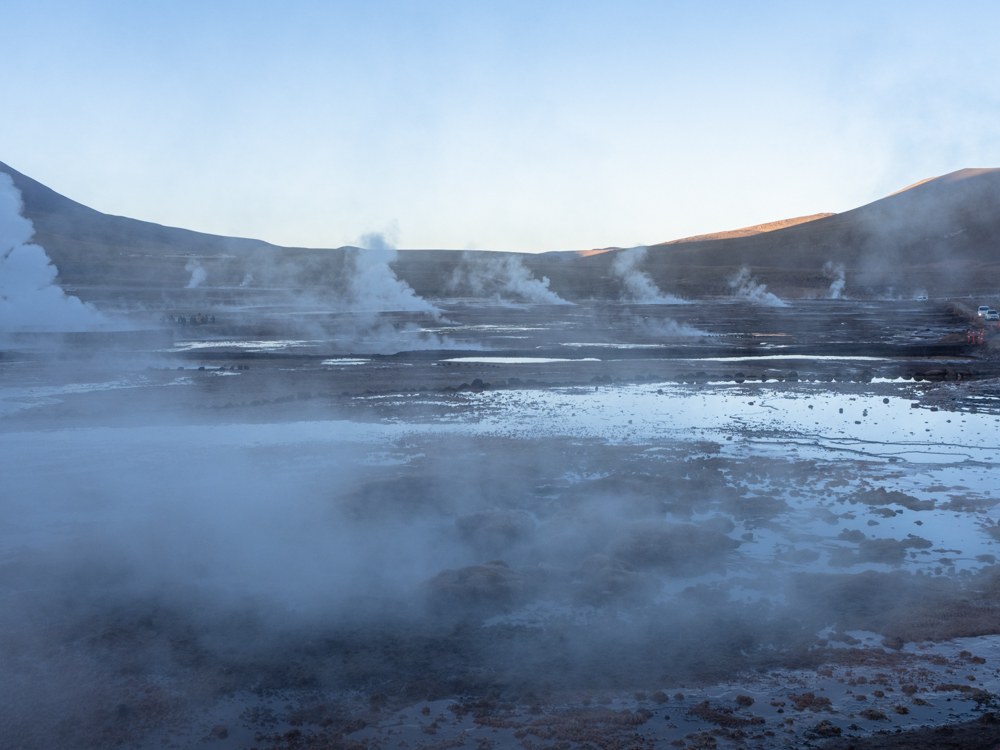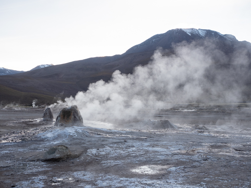 Es folgt ein weiterer Tag mit Ausflügen um San Pedro. Und auch wenn ich für die letzten Tage schon geschrieben habe, dass es früh losging, so geht es heute doch erst richtig früh los, um 5:30 Uhr. Es ist noch dunkel und die einstündige Fahrt zu den Tatis-Geysiren nutzen einige, um noch etwas Schlaf nachzuholen. Mit dem ersten Licht kommen wir bei den Geysiren an. Wir machen einen kurzen Stopp am Besucherzentrum. Schon hier merke ich, wie kalt es auf den knapp 4300m ist. Dann fahren wir noch einige Meter weiter zum Parkplatz. Ich ziehe alle Schichten an, die ich dabei habe, und friere trotzdem. Vielleicht geben die Geysire ja etwas Wärme ab. Wir folgen unserem Guide durch das Geysirfeld. Im Grunde kann man sich auf der offenen Fläche frei bewegen, einen offiziellen Weg gibt es nicht. Doch sollte man außerordentlich genau auf Steinmarkierungen achten, die aktive Geysire kennzeichnen und die Umrandung des Felds markieren. Man sollte die Steingrenzen auf keinen Fall überqueren, denn überall brodelt, zischt und dampft es aus der Erde. Mal sprudelt das Wasser aus dem Erdinneren heraus, manchmal hören wir es nur tief unter der Erde köcheln. Einige hundert Meter unter uns liegt eine Magmakammer, die das Wasser erhitzt und zum Aufsteigen bringt. Auch der Boden ist warm und so werden wenigstens die Füße nicht kalt. Wir haben nicht allzu viel Zeit bei den Geysiren, doch der Erde beim „Werken“ zuzusehen, ist wirklich spannend.