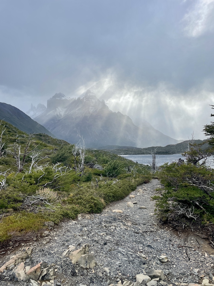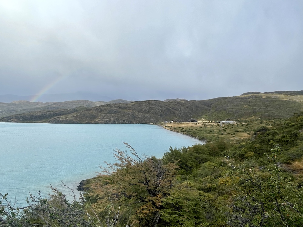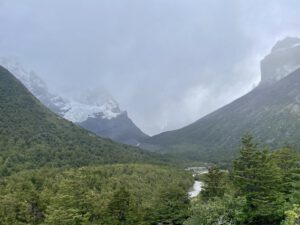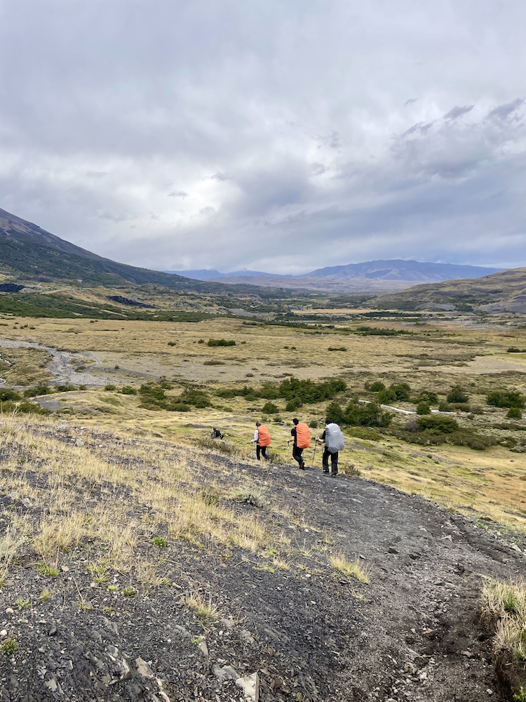 Den letzten Kilometer geht es durch ein Tal, an dessen Ende der Lago Pehoé und das Camp Paine Grande – unser Ziel für heute – liegen. Kurz bevor wir dort ankommen, beginnt es zu tröpfeln. Was wir da noch nicht wissen, ist, dass der Regen über die nächsten 40 Stunden nicht mehr aufhören und uns noch ganz schön zu schaffen machen wird.