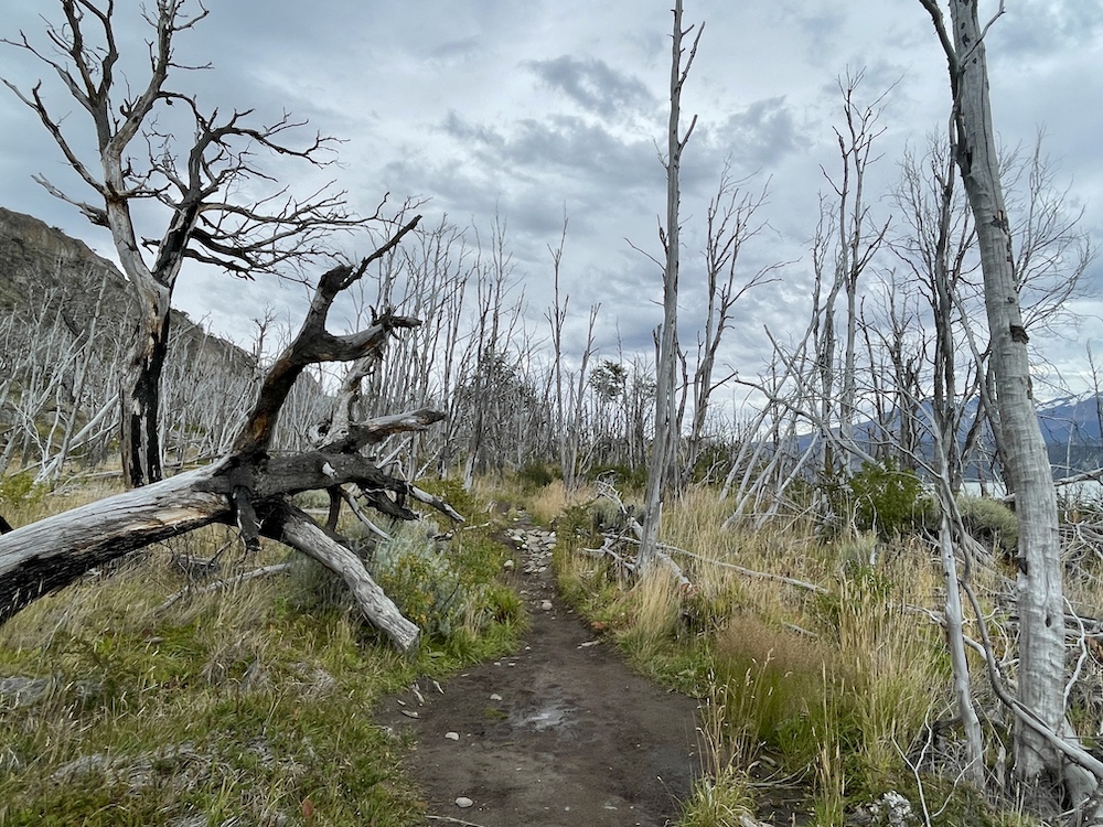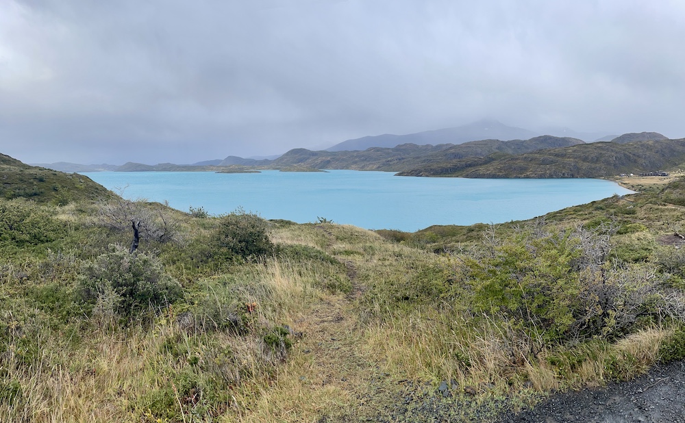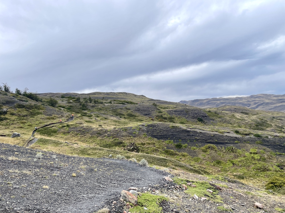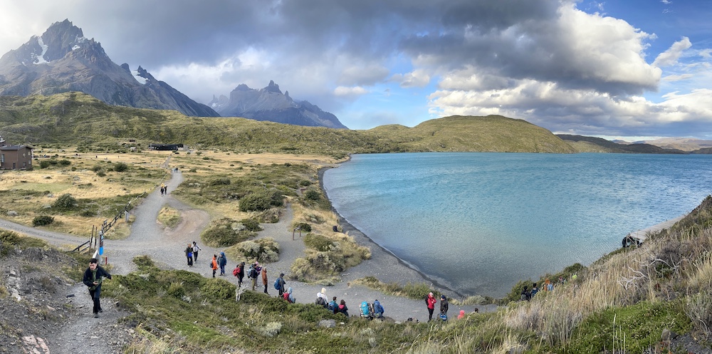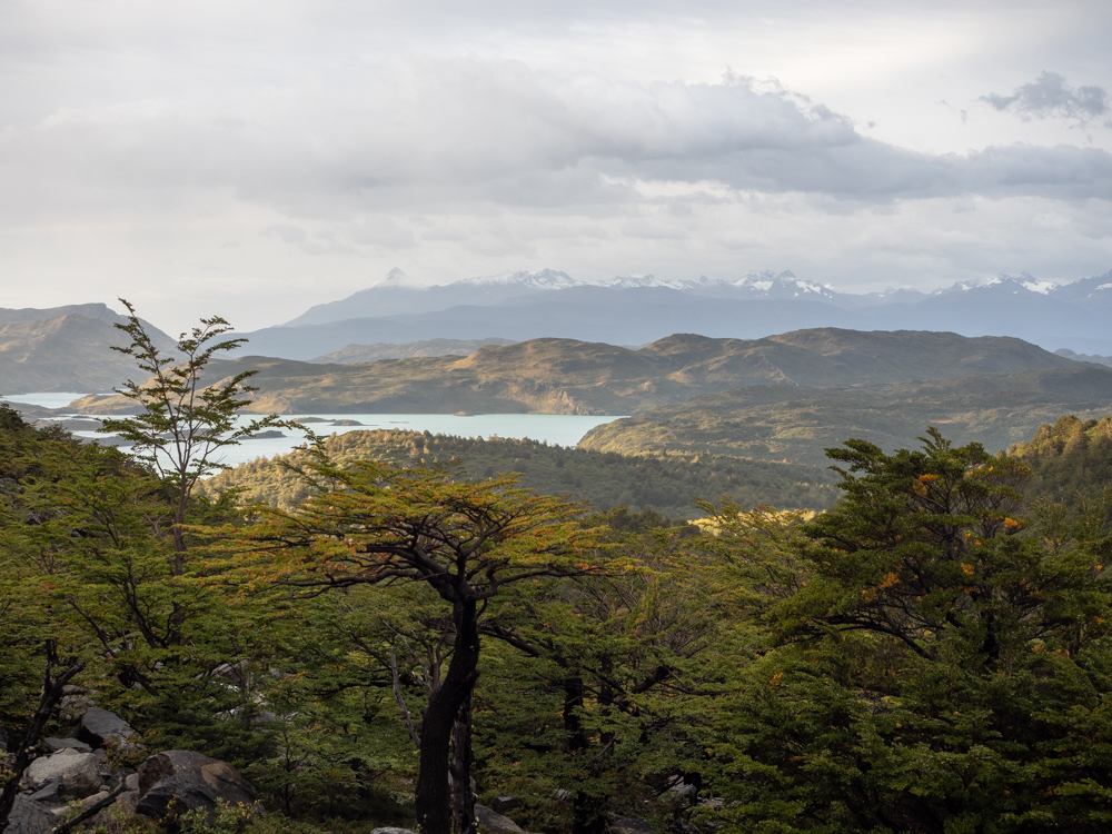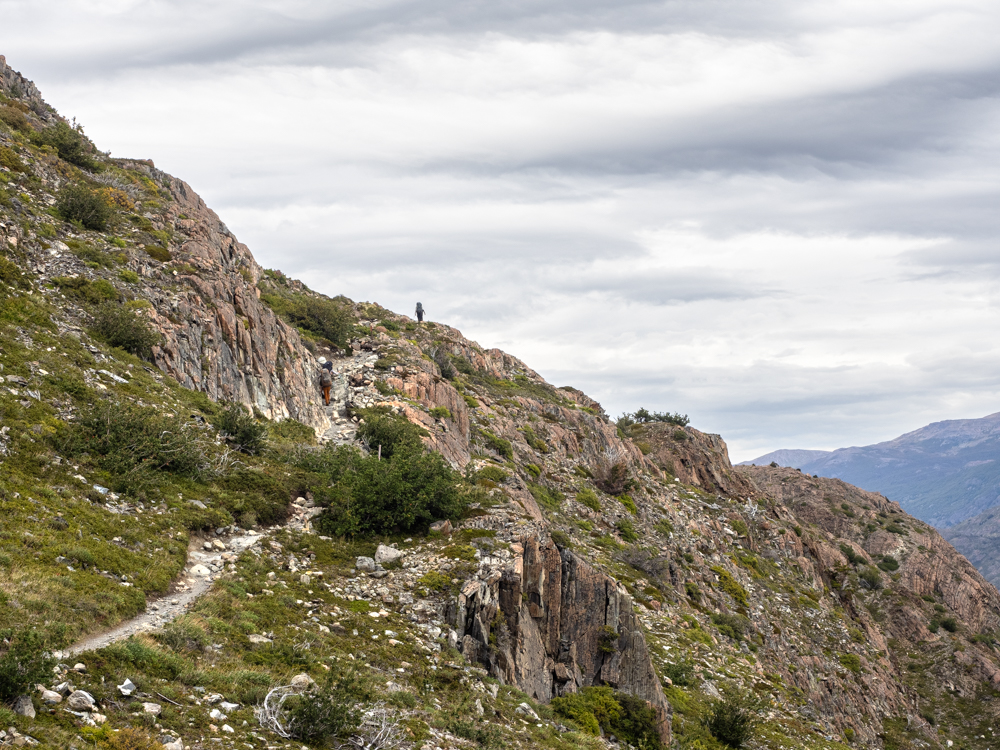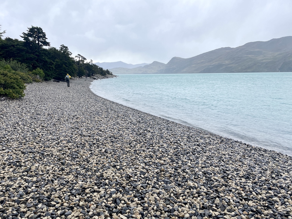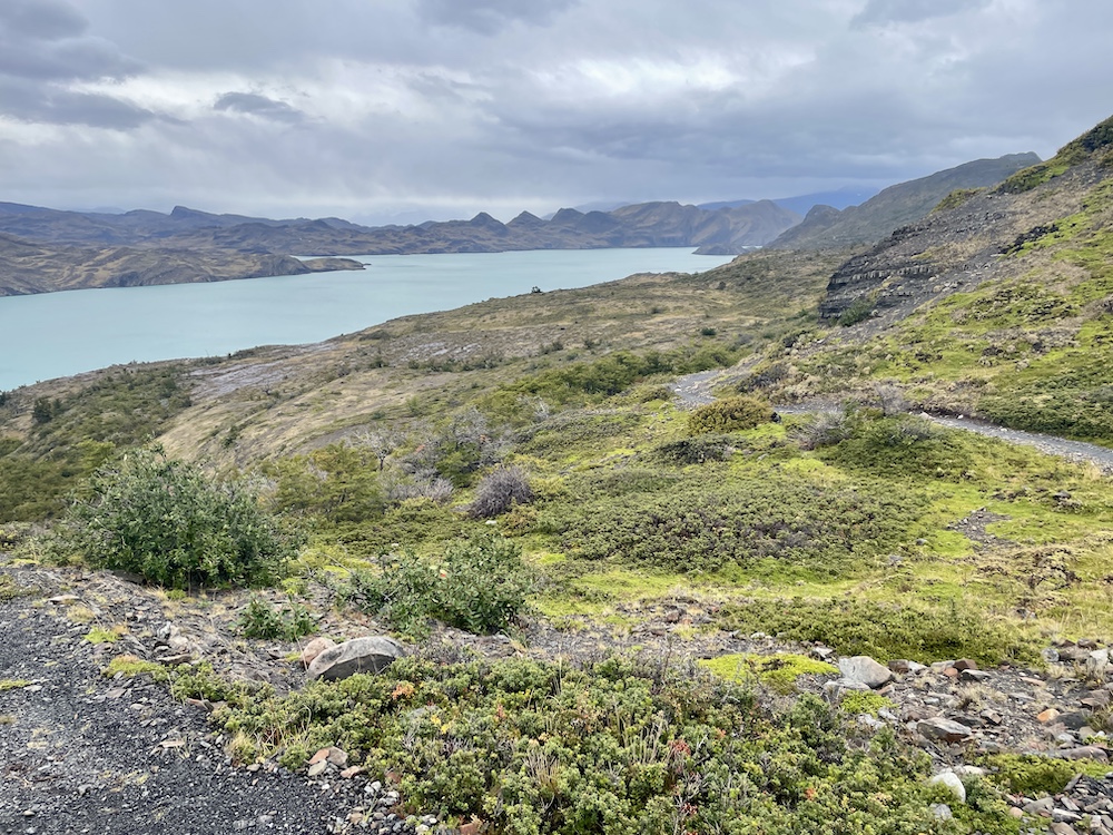 Da heute wieder eine eher kurze Etappe ansteht, beginnen wir den Tag gemütlich. Wir haben keine Eile, loszukommen, ganz im Gegensatz zu den vielen Wanderern, die heute ihre Tour auf dem W-Trek starten und eine längere Etappe vor sich haben. Das Grey Camp ist einer der Ausgangspunkte für den W-Trek, dem bekannteren Trek im Nationalpark, und da das W Teil des O’s ist, wandeln auch wir ab heute auf den Pfaden des W-Treks. Bis wir uns nach dem Frühstück langsam fertig machen, hat sich das Camp schon sehr geleert. Nur unsere Wanderkollegen, die ebenfalls den O-Trek machen und gestern über den Pass kamen, sind noch da. Sie gehen es ähnlich ruhig an wie wir. Der Weg führt ähnlich wie gestern an der Bergflanke entlang, mit dem Lago Grey zu unserer Rechten und dem Grey-Gletscher hinter uns. Viele Aussichtspunkte reihen sich entlang des Weges, einer schöner als der nächste. Ebensoviele Menschen sind dort unterwegs, allein, in Kleingruppen und vermehrt auch in größeren Gruppen.