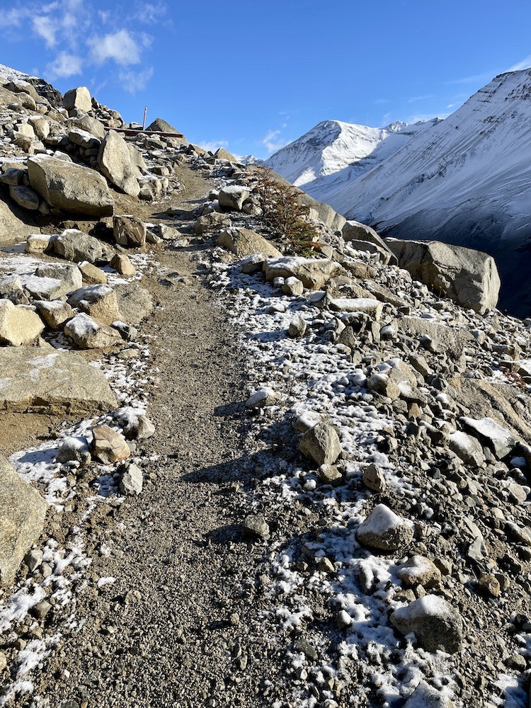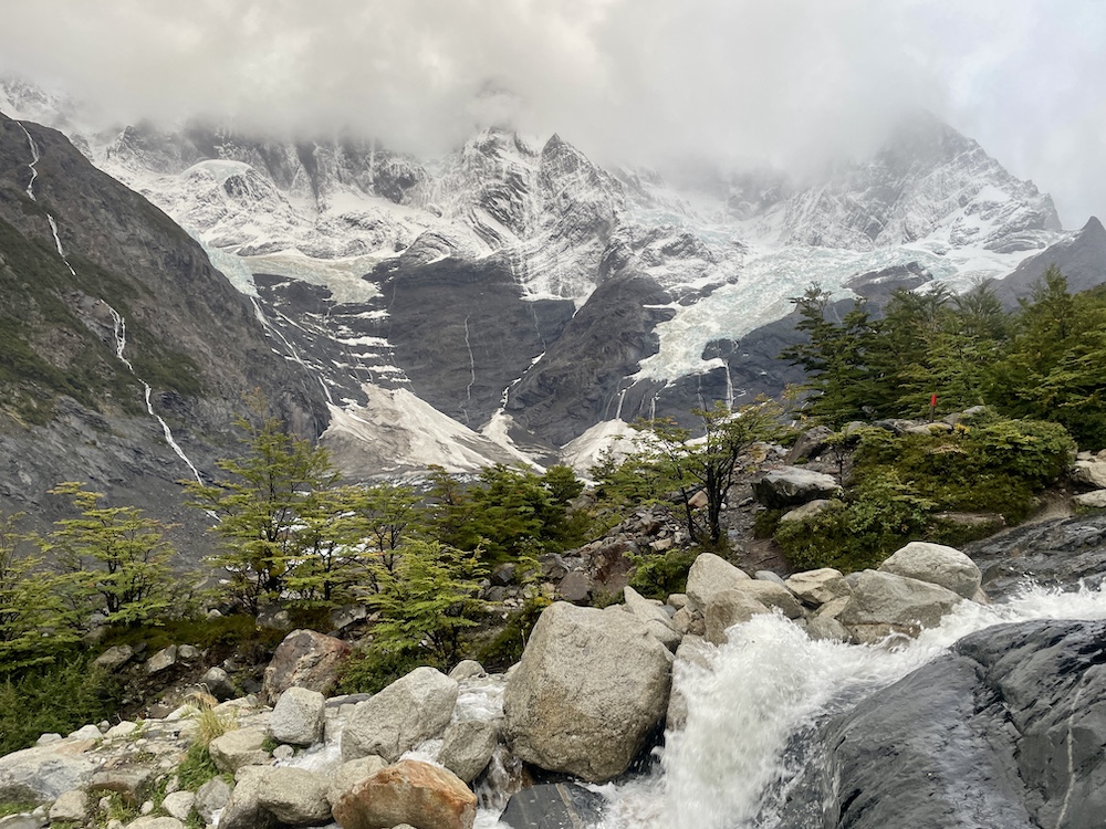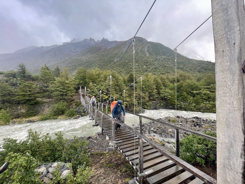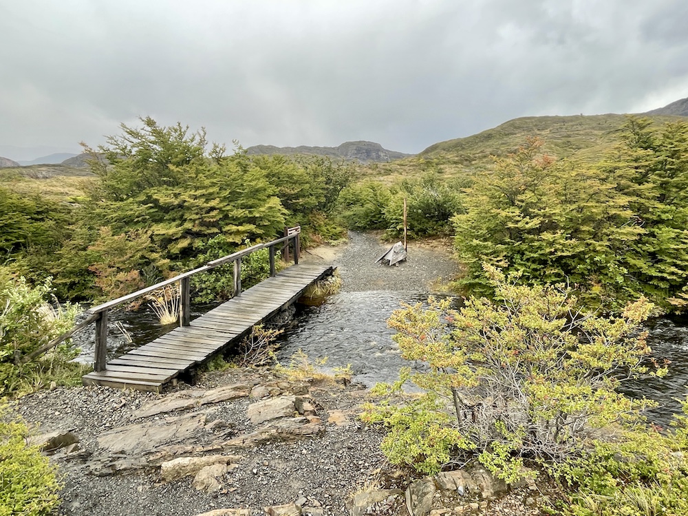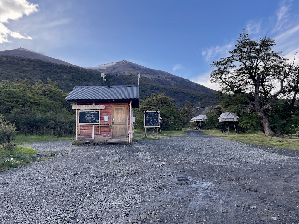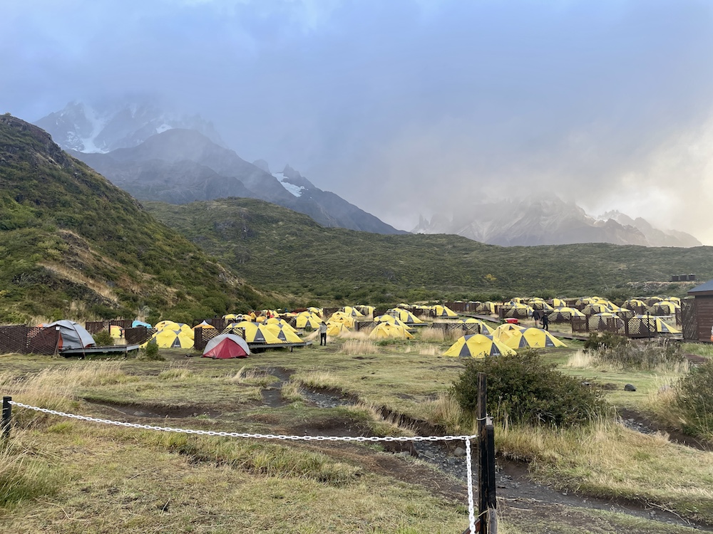 Vereinzelt kommen uns Wanderer entgegen. Doch viele sind heute nicht unterwegs. Gegen Ende staut es sich dann aber doch ein bisschen, denn der Weg ist großflächig überschwemmt und alle versuchen, möglichst trockene Tritte zu finden. Doch ohne nasse Füße kommt hier kaum jemand durch. Zum Glück haben wir es nicht mehr weit bis zum Camp Francés. Da der Weg ins Britanico-Tal und zum dortigen Aussichtspunkt gesperrt ist, ist unsere heutige Etappe wider Erwarten recht kurz und wir sind schon vor 12 Uhr am Camp. Check-in beginnt erst am Nachmittag. Anders als die Camps bisher sind die Zelte im Camp Francés sehr weitläufig über einen Hang verteilt. Dazwischen finden sich mehrere kleine Hütten, die als Aufenthaltsraum und zum Kochen dienen. Wir finden eine leere Hütte und belagern sie fürs Mittagessen. Das gibt uns auch die Gelegenheit, unsere nassen Sachen zu trocknen. Als wir dann später einchecken können – wir haben diese Nacht wieder Premium – erfahren wir, dass unsere beiden Zelte direkt neben der Hütte liegen, die wir eh schon in Beschlag genommen haben. Glück gehabt, so können wir alles gleich dort lassen. Das Camp bietet auch ein kleines Bistro und äußerst moderne Duschen, der Nachmittag ist also gerettet.