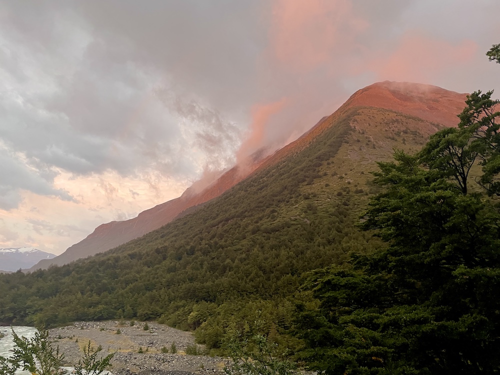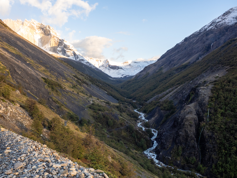 Es prasselt noch ordentlich, als wir aus dem Zelt kriechen. Noch vor Sonnenaufgang wollen wir los und heute versuchen, ins Britanico-Tal zu kommen. Wir haben die Hoffnung, dass der Weg, der gestern noch gesperrt war, heute wieder offen ist. Das bedeutet, eine halbe Stunde wieder zurückzulaufen, um dort den Abzweig zu nehmen. Wir wollen rechtzeitig los, denn unsere geplante Etappe wollen wir anschließend ja auch noch schaffen. Unsere Rucksäcke lassen wir erst noch im Camp und laufen mit leichtem Gepäck los. Dementsprechend kommen wir schnell voran. Auch hat es mittlerweile endlich aufgehört, zu regnen. Nach einer halben Stunde erreichen wir das Camp Italiano, den Ausgangspunkt zum Britanico-Tal. Noch bevor wir richtig dort sind, erkennen wir, dass der Weg weiterhin gesperrt ist. Wir klopfen an der Rangerstation und scheuchen wohl einen Park-Ranger aus dem Bett. Auf Nachfrage erlaubt er uns, einen Teil des Weges zu gehen. Aber weit werden wir nicht kommen, sagt er, denn aufgrund des vielen Regens sind die Bäche, die man sonst einfach zu Fuß überqueren kann, zu einem unüberwindbaren Hindernis angeschwollen. Wir wollen es trotzdem versuchen. Die Sonne geht gerade auf und taucht die Berge in ein tiefes Orange. Die Aussicht ins Tal und auf den Lago Nordenskiöld ist umwerfend. Aus der anderen Richtung, aus dem Tal, hören wir es immer wieder donnern: große Eisblöcke, die vom Gletscher abbrechen und als Lawinen ins Tal gehen. Zunächst kommen wir noch relativ gut trockenen Fußes durch den Wald. Dann wird der Boden nässer und nässer, bis wir schließlich praktisch in einem Bach laufen. Bald kommen wir zu der besagten Flussüberquerung und nachdem wir etwas oberhalb und unterhalb des Weges gecheckt haben, steht ziemlich schnell fest, dass wir hier nicht weiterkommen. Die Aussicht genießen wir trotzdem.