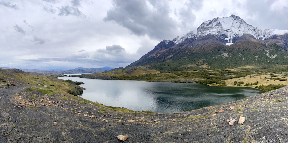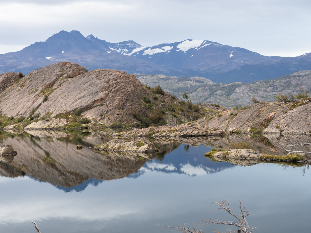 Wir genießen nochmal die Aussicht auf den Grey-Gletscher in der Ferne und erinnern uns, wie wir gestern ganz dort hinten über den Pass kamen. Dann biegt der Weg nach links ab und der Gletscher, der uns nun knapp 24 Stunden begleitet hat, verschwindet aus unserem Sichtfeld. Wir kommen an einer wunderschönen Lagune vorbei. Bei nahezu windstillen Bedingungen ist das Wasser spiegelglatt.