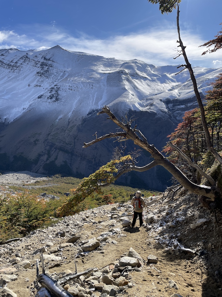 Nachdem wir uns kurz vom Aufstieg erholt und mit Schokolade gestärkt haben, können wir den Ausblick so richtig genießen. Vor uns schimmert die Lagune, dahinter ragen die Torres empor, vor strahlend blauem Himmel. Genau so haben wir uns das vorgestellt, doch hatten wir nach unseren Erfahrungen mit dem patagonischen Wetter teilweise daran gezweifelt, es noch hierhin zu schaffen und die Torres auch zu sehen. Wir können uns kaum losreißen von diesem traumhaften Anblick. Erst als uns der Wind dann doch zu kalt wird und immer mehr Leute eintrudeln, beschließen wir, den Rückweg anzutreten. Und jetzt zeigt es sich nochmal umso mehr, welches Glück wir hatten, denn nun strömen die Leute in Massen an. In kürzester Zeit müssen über 100 Menschen dort oben sein. Zufrieden und mit vielen tollen Erinnerungen im Gepäck laufen wir den gleichen Weg zurück, den wir gekommen waren. Unterwegs machen wir noch eine Pause für unser letztes Trail-Mittagessen.
