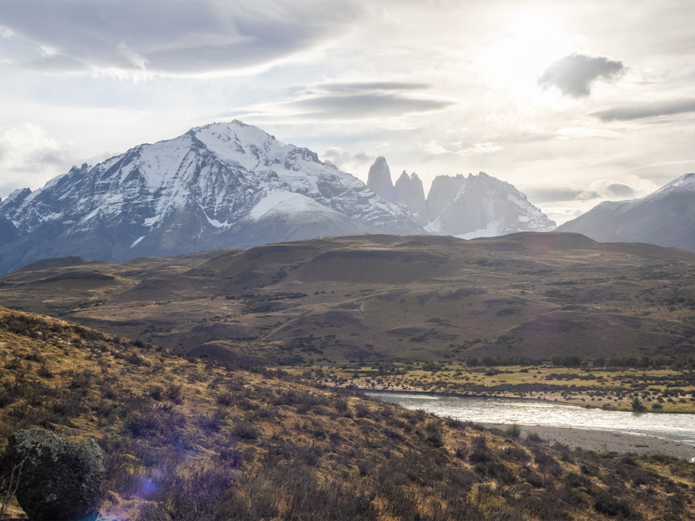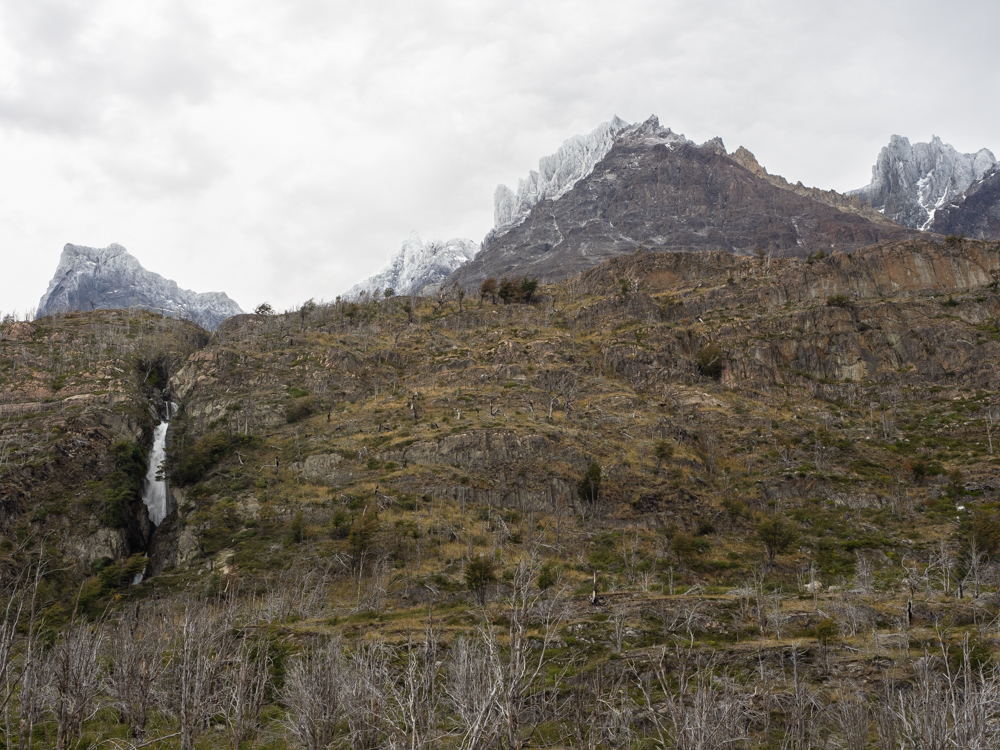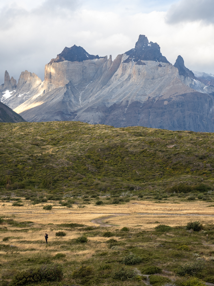 Zurück im Camp Francés picken wir unsere Sachen wieder auf und machen uns auf die eigentliche Etappe für heute. Es geht ein bisschen bergauf, bevor wir bis zum Ufer des Lago Nordenskiöld absteigen und an einem kleinen Kiesstrand entlanglaufen. Auch hier ist der Weg teilweise komplett überschwemmt. Mittlerweile regnet es auch wieder. Nach knapp zwei Stunden erreichen wir das Camp Los Cuernos. Zeit für ein Mittagessen. Wir sind froh, drinnen im Aufenthaltsraum sitzen zu können. Anschließend geht es wieder bergauf und dann noch eine ganze Weile entlang des Lago Nordenskiöld. Für die letzten Kilometer führt der Weg landeinwärts und bald erblicken wir den Sektor Central, wo wir vor sieben Tagen gestartet sind. Das letzte Stück zieht sich dann noch ein bisschen und einige Bäche müssen wir auch noch überqueren. Dann kommen wir am Hotel Las Torres vorbei und etwas dahinter dann zum Camp Central. Auch für diese Nacht haben wir noch einmal ein Premiumzelt. Es liegt am Rand des Zeltplatzes neben einem kleinen Parkplatz. Auf einmal kommt unsere Zeltnachbarin ganz aufgebracht angerannt und berichtet, sie hätte einen Puma auf dem Parkplatz gesehen. Ich schnappe meine Kamera und halte Ausschau. Und tatsächlich, dort auf dem Hügel hinter unserem Zelt schleicht ein Puma. Ich bekomme ihn gerade noch zu Gesicht, bevor er im Dickicht verschwindet.