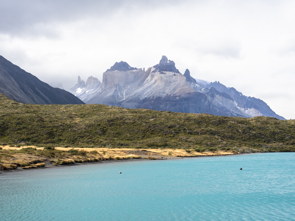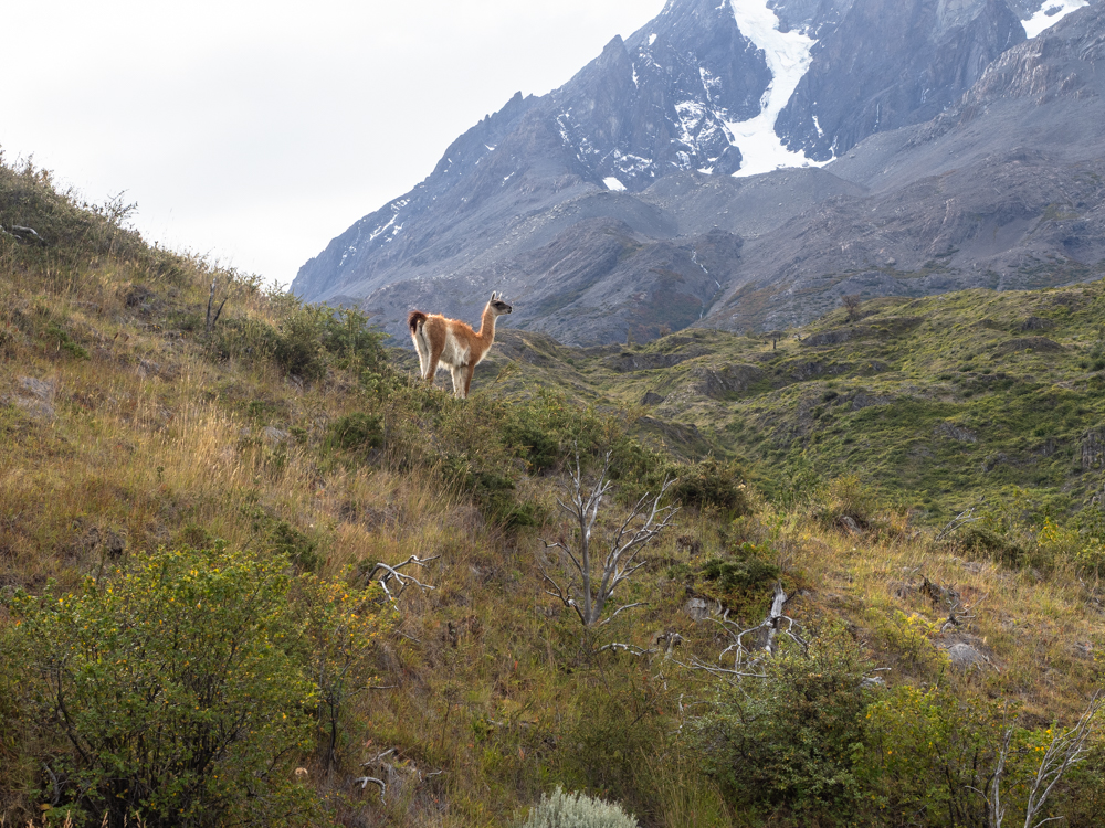 Im Camp bekommen wir ein Update zum Wetterbericht. Zwar wussten wir, dass für den nächsten Tag Regen und Sturm angesagt waren, doch jetzt wurde die Vorhersage im Hinblick auf Regenmenge und Windgeschwindigkeit nochmal nach oben korrigiert. Böen bis 130 km/h soll es geben. Wir fragen die Leute im Camp, wie das ein Zelt aushalten soll. Doch die Campangestellten sind entspannt. Wir sollen einfach nahe des Hügels bleiben und unsere Zelte zwischen andere Zelte stellen. Und meistens kommt es eh nicht so schlimm wie vorhergesagt. Besorgt scheint hier keiner zu sein und wir sind uns unsicher, ob uns das beruhigen soll oder eher noch nervöser macht. Wir entscheiden uns für ersteres, bauen unsere Zelte möglichst windgeschützt auf und machen dann erst mal Mittagessen. Am Nachmittag erkunden wir die nähere Umgebung. Immer mal wieder ragt das Paine-Grande-Massiv durch die Wolken und mit dem türkisfarbenen Wasser des Lago Pehoé gibt das ein tolles Bild ab. Später bekommen wir noch Besuch von einem Guanako, das sich nahe des Camps eine Stärkung holt.