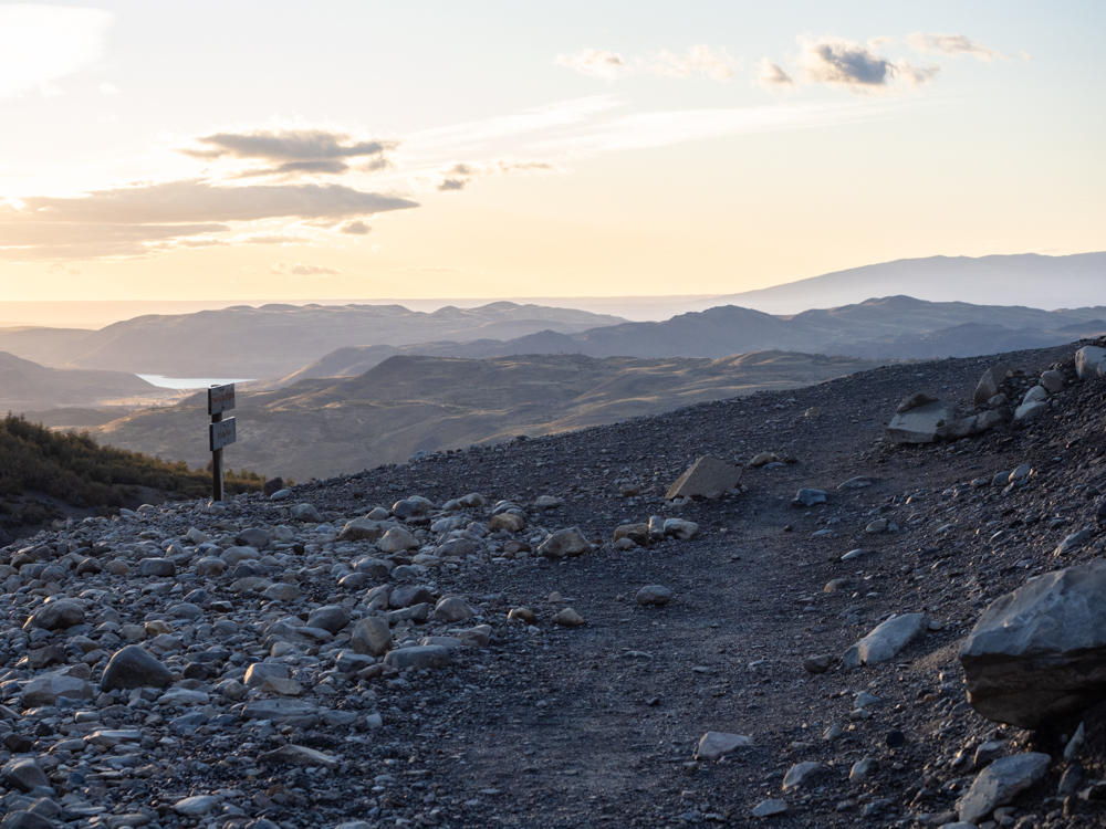 Gegen 4 Uhr wache ich vom Wind auf. Es bläst ordentlich da draußen und die Zeltstangen biegen sich bedrohlich. Immer wieder zieht ein Schauer durch und ich bin überrascht, dass wir hier drin noch so trocken sind. Dann, wenn ich gerade denke, dass das Schlimmste jetzt wohl vorüber ist, kommt eine neue Böe und drückt das Zeltdach fast auf den Boden. Doch das Zelt hält. Und wir halten auch. Wir machen uns so gut es geht im Zelt fertig und packen alles zusammen, bevor wir uns raus wagen. Das Zelt packen wir auch direkt zusammen, um Schlimmeres zu vermeiden. Im Aufenthaltsraum treffen wir auf andere, die wohl während der Nacht nach drinnen umgezogen waren und dort ihre Isomatten ausgerollt haben. Doch im Großen und Ganzen haben es alle gut überstanden und um ehrlich zu sein, kamen wohl auch die stärksten Böen nicht an die vorhergesagten 130 km/h ran. Der Wind wird über den Morgen hin schwächer, doch der Regen hält sich und so wandern wir, so gut es geht gegen Regen geschützt, los. Nach nur wenigen Metern überholt uns ein Ranger mit einem „Trail closed“-Schild unter dem Arm. Wenig später erfahren wir auch, um welchen Trail es sich handelt, als wir vor dem gesperrten Weg um den Lago Sköttsberg stehen. Es gibt hier zwei Wege, auf jeder Uferseite einer, um die Wanderströme besser zu verteilen. In unsere Richtung hätten wir eigentlich den Weg zu unserer Rechten nehmen sollen, doch der ist gesperrt, da der Wind immer noch sehr stark weht und das Wasser des Sees zum fliegen bringt. Wir nehmen also die Luv-Seite und bekommen so wenigstens nur den Regen, nicht aber noch die Wassermassen des Lago Sköttsberg ins Gesicht.