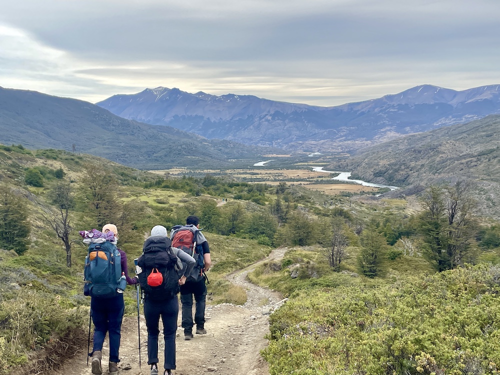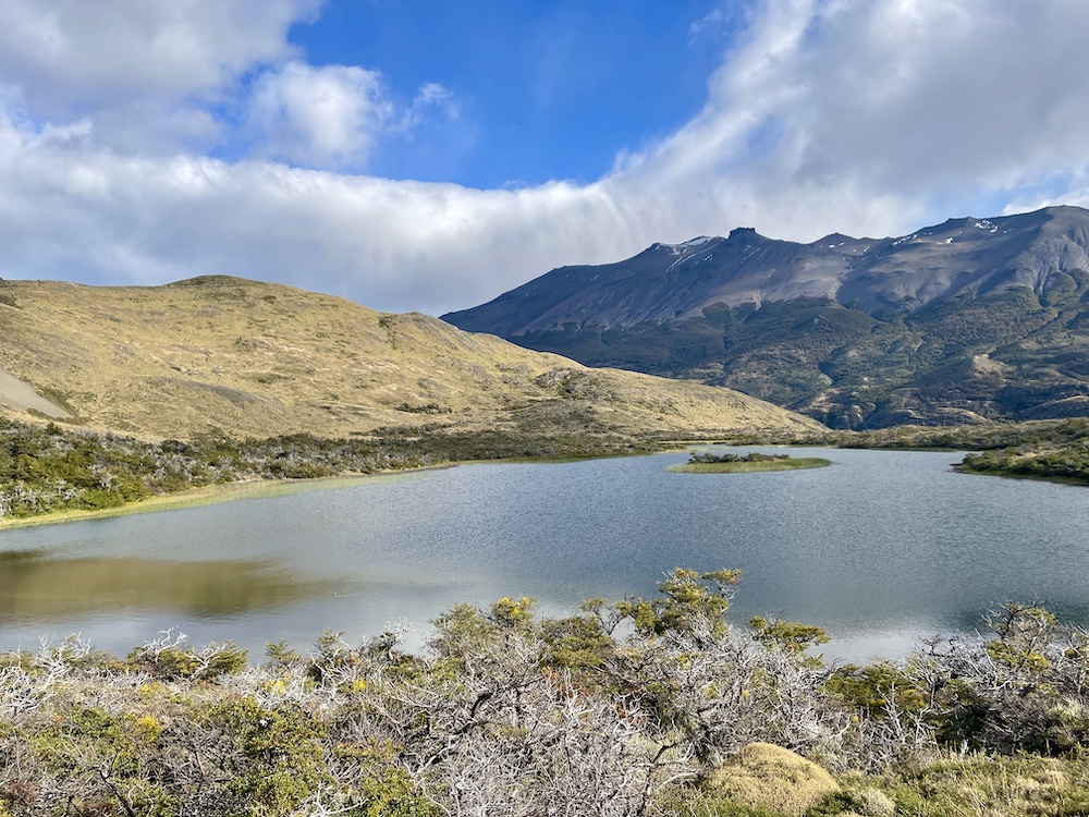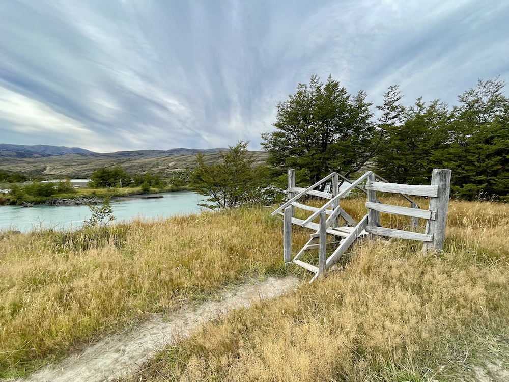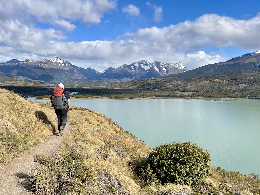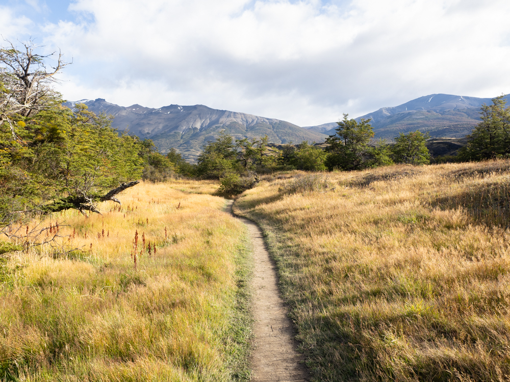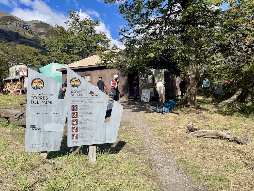 Die Sonne geht erst relativ spät, gegen 8 Uhr, auf. Dementsprechend haben wir es auch nicht eilig, loszukommen. Wir machen uns ein gemütliches Frühstück und packen dann zusammen. Es ist bestes patagonisches Wetter. Sonne und um die 20 Grad. Die ersten Kilometer geht es am Ufer des Rio Paine entlang durch eine Graslandschaft. Dann biegen wir links ab, kommen an einer Lagune vorbei, bevor uns der Weg nach oben führt. Jetzt sind wir an der nördlichen Flanke des Massivs und wandern geradewegs nach Westen. Rechts unter uns erstreckt sich der Lago Paine und glitzert in wunderschönem Türkis. Ein guter Platz für eine erste Pause. Dann geht es noch etwas weiter, bis wir nach 9km die Coirón Ranger Station erreichen. Hier treffen wir einige Wanderer wieder, die auch im Serón Camp waren und nun beim Mittagessen sind. Auch wir verbringen hier unsere Mittagspause, doch erst nachdem wir uns in die Gästeliste eingetragen haben. An allen Camps und Rangerstationen liegt eine solche Liste aus, in die man sich mit Namen, Passnummer, Beruf, Heimatort, Ankunftszeit, und Tagesziel einträgt. Was für deutsche Datenschützer ein Dorn im Auge wäre, ist hier eine bewährte Methode, um im Notfall ausfindig zu machen, wo vermisste Wanderer zuletzt unterwegs waren. Die Rangerin erklärt uns außerdem, dass jedes Camp und jede Rangerstation eine „Trail Closing Time“ ausweist. Bis zu diesem Zeitpunkt muss man von dem jeweiligen Ort aufgebrochen sein, um das nächste Camp noch vor Einbruch der Dunkelheit zu erreichen. Für die Coirón-Station liegt die Zeit bei 16 Uhr. Wir haben also genügend Zeit und laufen nach unserem Mittagessen gestärkt weiter.