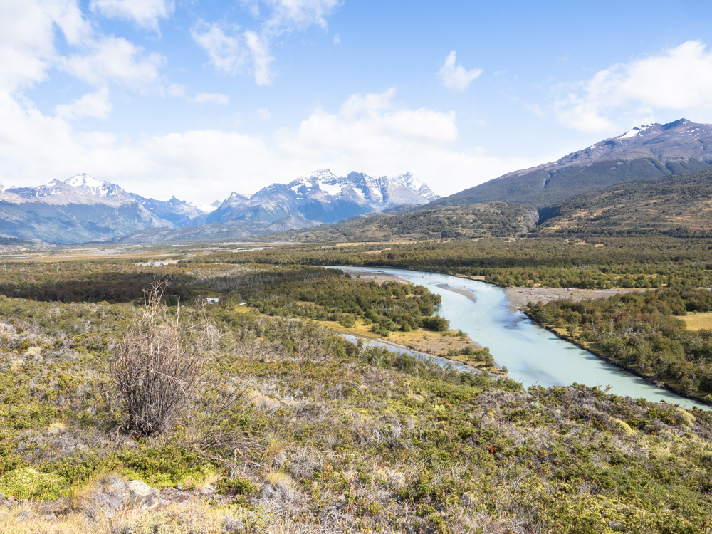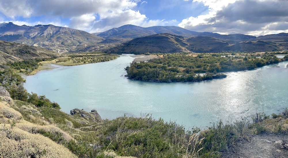 Zu Beginn haben wir etwas Schwierigkeiten, den richtigen Weg zu finden (das W ist deutlich besser ausgeschildert als das O), doch bald sind wir auf dem richtigen Weg und es geht sanft bergauf. Die meisten anderen Wanderer, die mit uns im Bus angekommen sind, haben andere Wege genommen und so sind wir bald alleine unterwegs. Es öffnet sich ein fantastischer Blick über Hügelketten, kleine Seen und das Tal des Paine-Flusses. Wir laufen stets Richtung Norden und der Weg ist gut zu gehen. Am Ufer des Flusses finden wir einen schönen Platz zum Mittagessen. Es gibt (wie von nun an jeden Mittag): Tortillas mit wahlweise Käse und Kräuterpaté oder Erdnussbutter und Marmelade und dazu eine Suppe. Das erste Mittagessen auf dem Trail schmeckt vorzüglich und das Wasser direkt aus dem Fluss ist angenehm frisch. Es geht noch einige Kilometer weiter durch eine Graslandschaft und kleinere Wäldchen. Wir begegnen einer großen Herde Pferde, die hier ausreichend Nahrung finden. Und dann sind wir schon bald am Camp Serón angekommen. Die erste Etappe von etwa 15km ist geschafft.