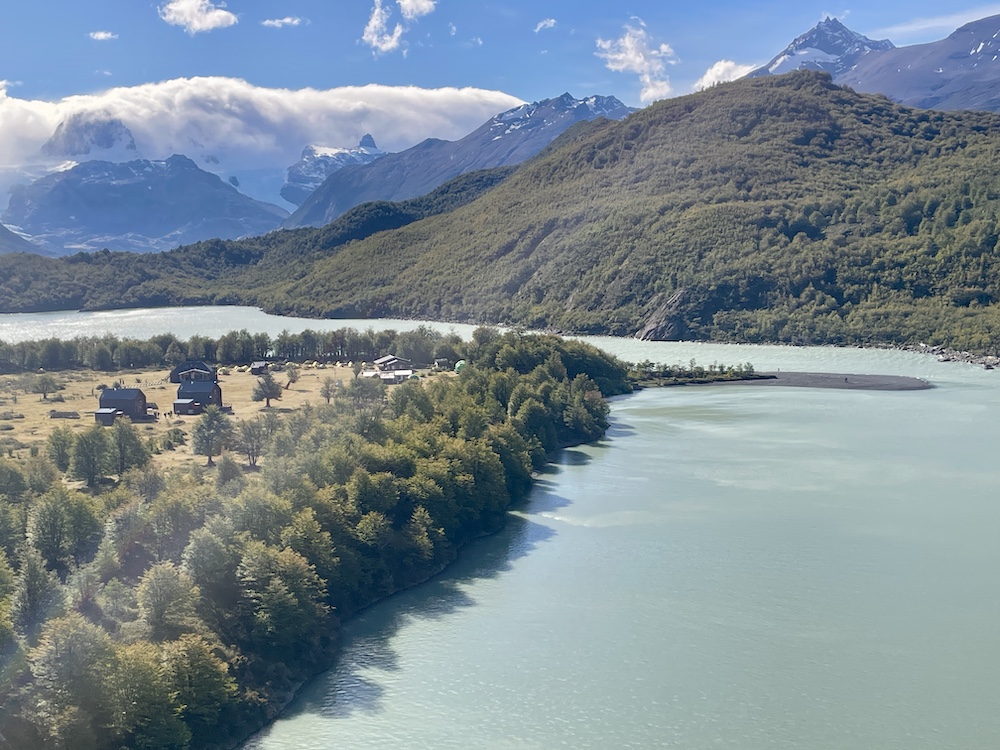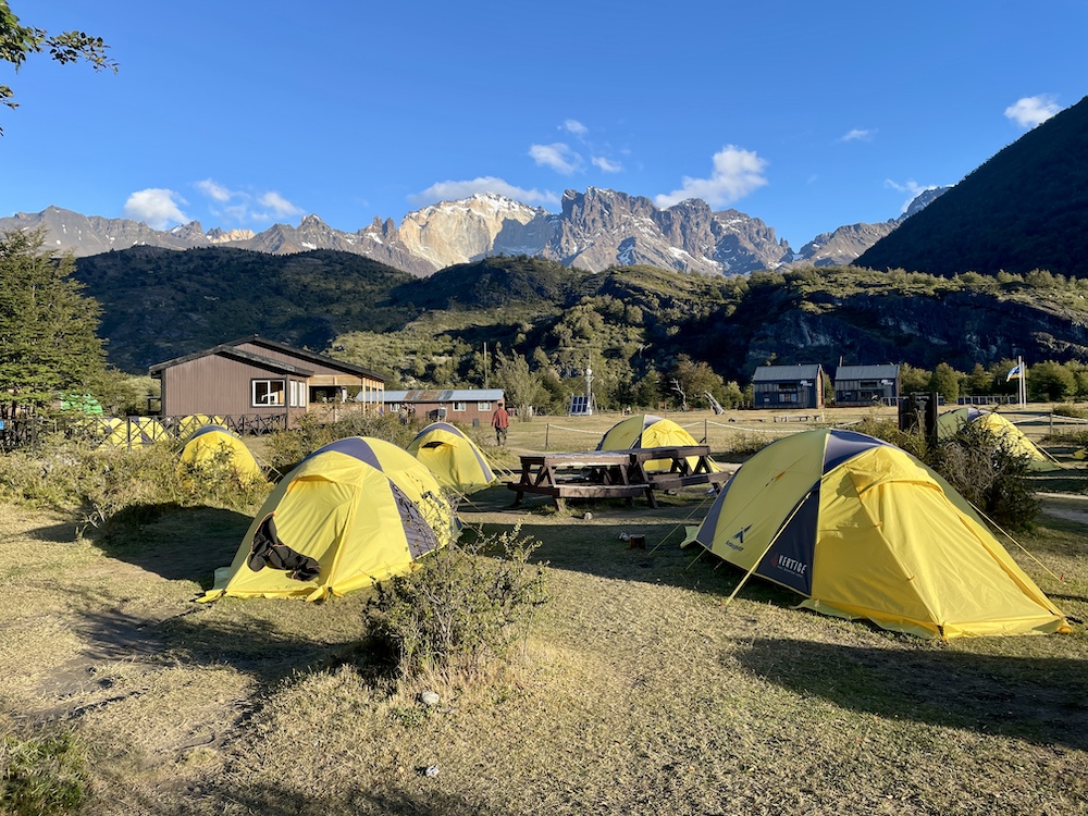 Und nun stehen wir also hier, erwarten unser gezahltes Premiumzelt und wundern uns dementsprechend, als uns die Campleiterin den Anhänger für unser eigenes Zelt entgegenhält und uns sagt, wir sollen uns auf der Wiese einen Platz aussuchen. Wir haben doch Premium gebucht, sagen wir. Sie schaut nochmal im Computer nach und tatsächlich, da steht es. Sie nimmt uns den Anhänger wieder weg. Aber falls es noch freie Zeltplätze gibt, könnten wir auch unser eigenes Zelt aufstellen, sagen wir. Wir haben es ja ohnehin dabei. Nein, nein, alles voll, bekommen wir als Antwort. Also belassen wir es dabei. Eine zweite Campangestellte bringt uns zu unseren zwei Premium-Zelten. Sie liegen auf einer Anhöhe etwas oberhalb der Wiese, wo Paulo und Edoardo gerade ihr Zelt aufbauen. Die Zelte sind eigentlich für zwei Personen ausgelegt, daher mussten wir für uns drei auch zwei Zelte buchen. Doch als wir nun davor stehen und den ersten Blick hineinwerfen, sind wir positiv überrascht, wie groß die Zelte sind. Wir passen locker auch zu dritt in ein Zelt. Also nehmen wir Mädels das eine Zelt und bieten den Jungs das zweite an. Sie packen ihr eigenes Zelt wieder ein und kommen zu uns auf die Anhöhe. Von hier oben hat man einen wunderbaren Blick über die Landschaft bis zum Rio Paine. Unter uns auf einer riesigen Wiese stehen vereinzelt ein paar Zelte. Alles voll, hallen uns die Worte der Campleiterin im Ohr. Na ja, wir versuchen, uns nicht weiter darüber aufzuregen, sondern die nächsten Tage zu genießen.