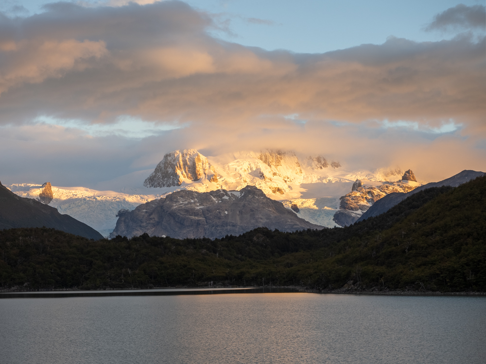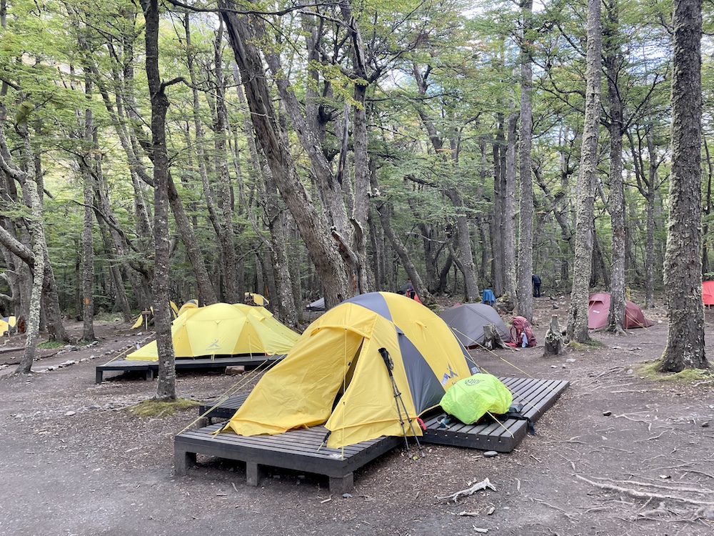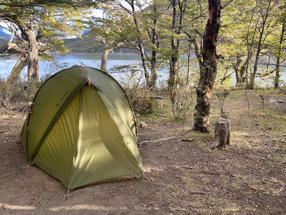 Dickson heißt auch unser Camp für die heutige Nacht. Wir können es schon aus der Ferne auf der anderen Seite des Lago Dickson sehen. Am Ende geht es nochmal sehr steil bergab, dann stehen wir auf einer kleinen Halbinsel, auf der das Camp liegt. Wir melden uns an der Rezeption an und dürfen uns in einem kleinen Waldstück einen Zeltplatz aussuchen. Dieses Mal haben wir kein Premium, sondern stellen unsere eigenen Zelte auf. Nicht weit vom Ufer finden wir zwischen ein paar Bäumen die passenden Plätze. Nachdem das Zelt steht, gönnen wir uns eine heiße Dusche (wann hat man schon mal die Gelegenheit auf einer Mehrtagestour). Am Abend bewundern wir den Sternenhimmel und den Vollmond, der gerade aufgeht.