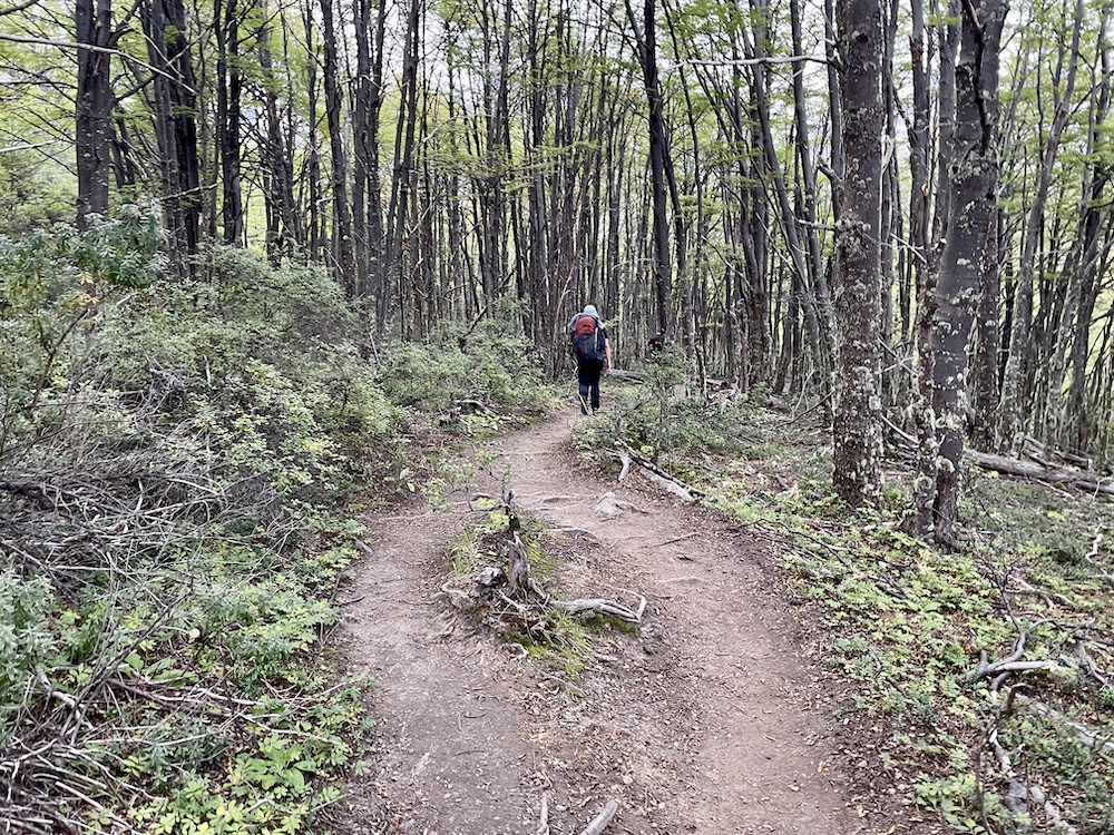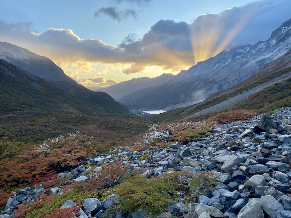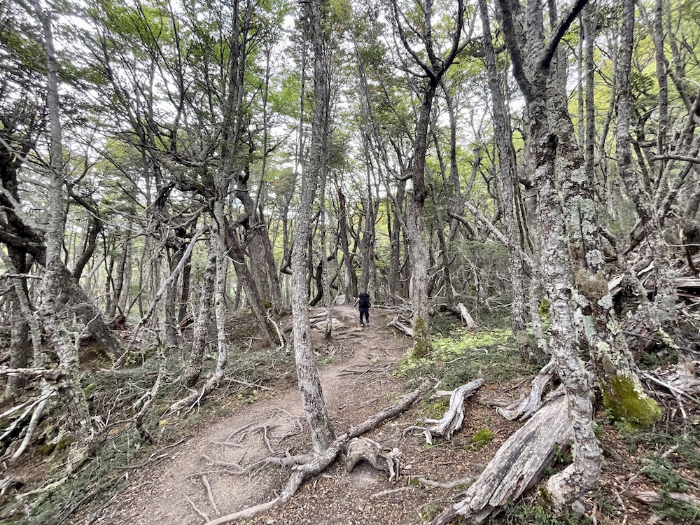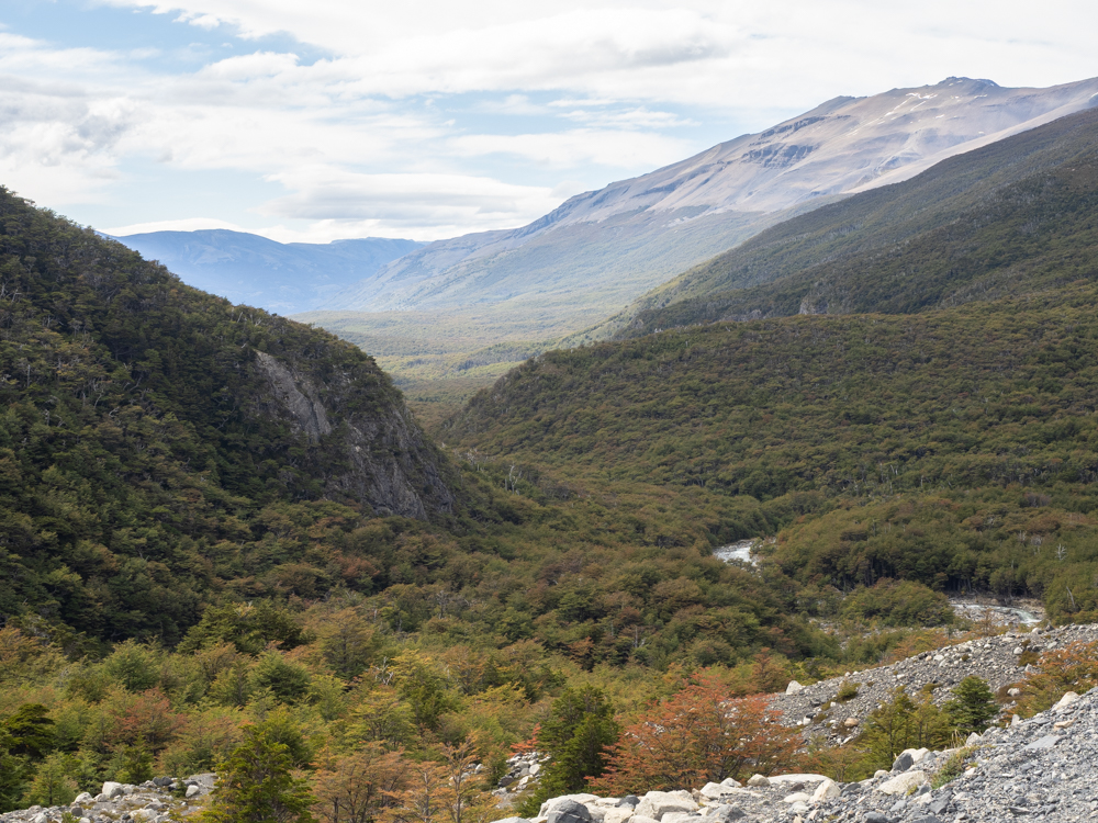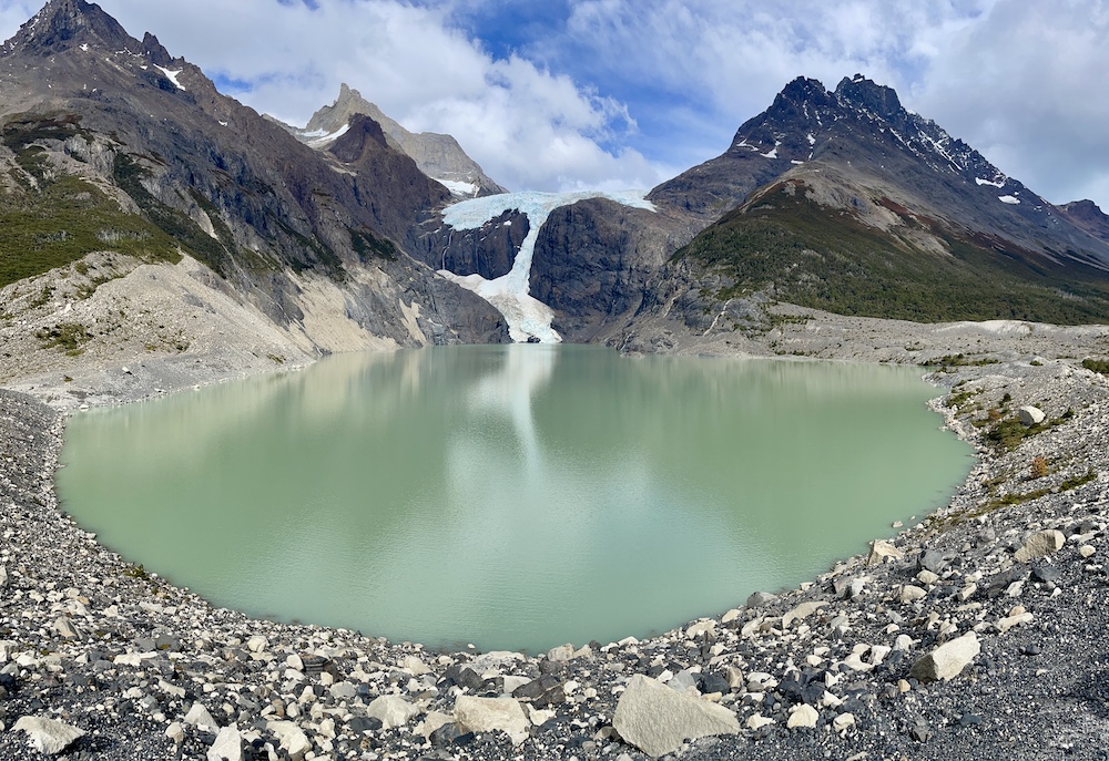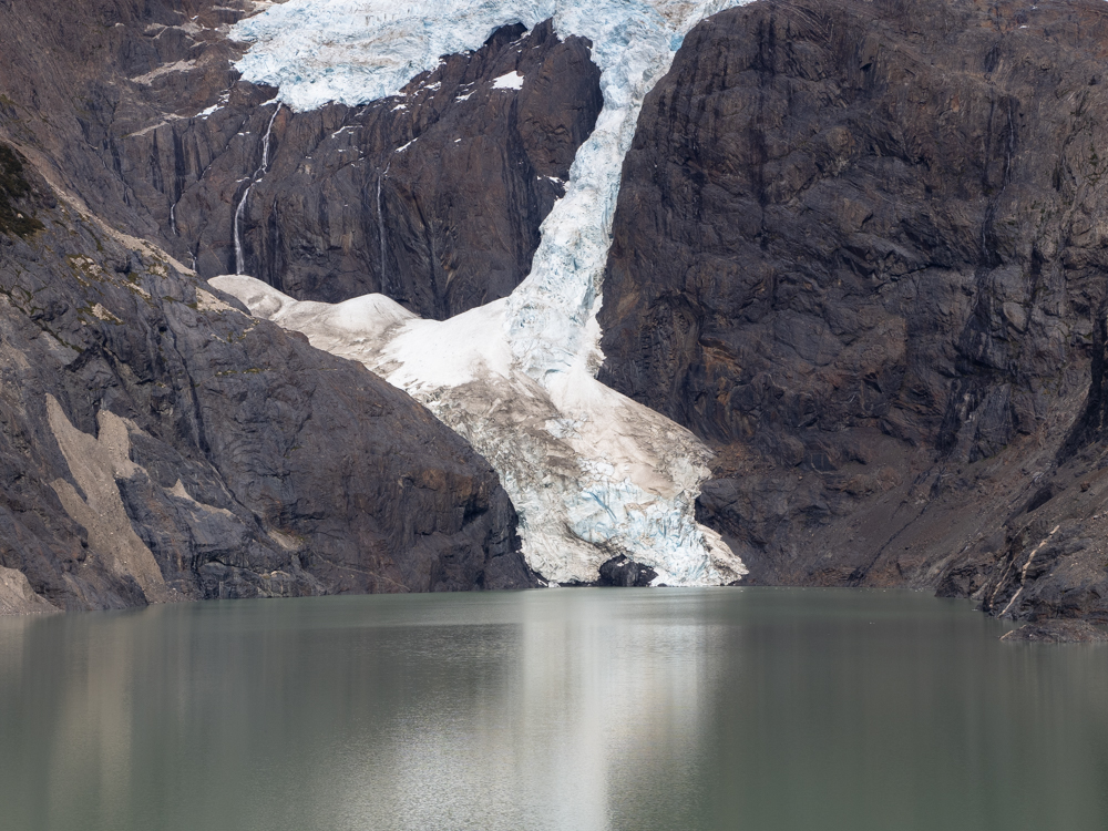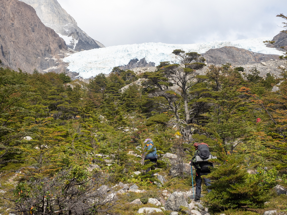Heute steht eine etwas kürzere Etappe auf dem Plan, nur knapp 10 km. Zunächst geht es durch den Wald bergauf. Als sich der Wald etwas öffnet, blicken wir noch einmal zurück auf den Lago Dickson und den Dickson-Gletscher. Da die Route heute überwiegend durch den Wald führt, bieten sich nicht so viele Aussichtspunkte und wir nutzen jede Gelegenheit. Aber auch der Wald ist schön und es hat etwas sehr Beruhigendes, hier entlangzulaufen. Gegen Ende der Etappen gelangen wir dann auf ein Geröllfeld. Hier geht es nochmal recht steil bergauf und nun wird auch der Wald lichter. Im Tal unter uns können wir erahnen, wo wir heute Morgen gestartet sind. Dann stehen wir plötzlich vor einem Art Steinwall (genauer gesagt einer Endmoräne) und als wir ihn erklommen haben, blicken wir in das milchige Wasser der Laguna los Perros, in die auf der anderen Seite der Los Perros-Gletscher mündet. Wie gebannt stehen wir da und können die Aussicht, die sich auf einmal vor uns auftut, kaum fassen. Wir entschließen uns, hier nur eine kurze Pause zu machen und weiter bis zum Camp Los Perros zu laufen, denn bis dorthin ist es nicht mehr weit.