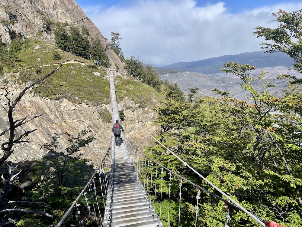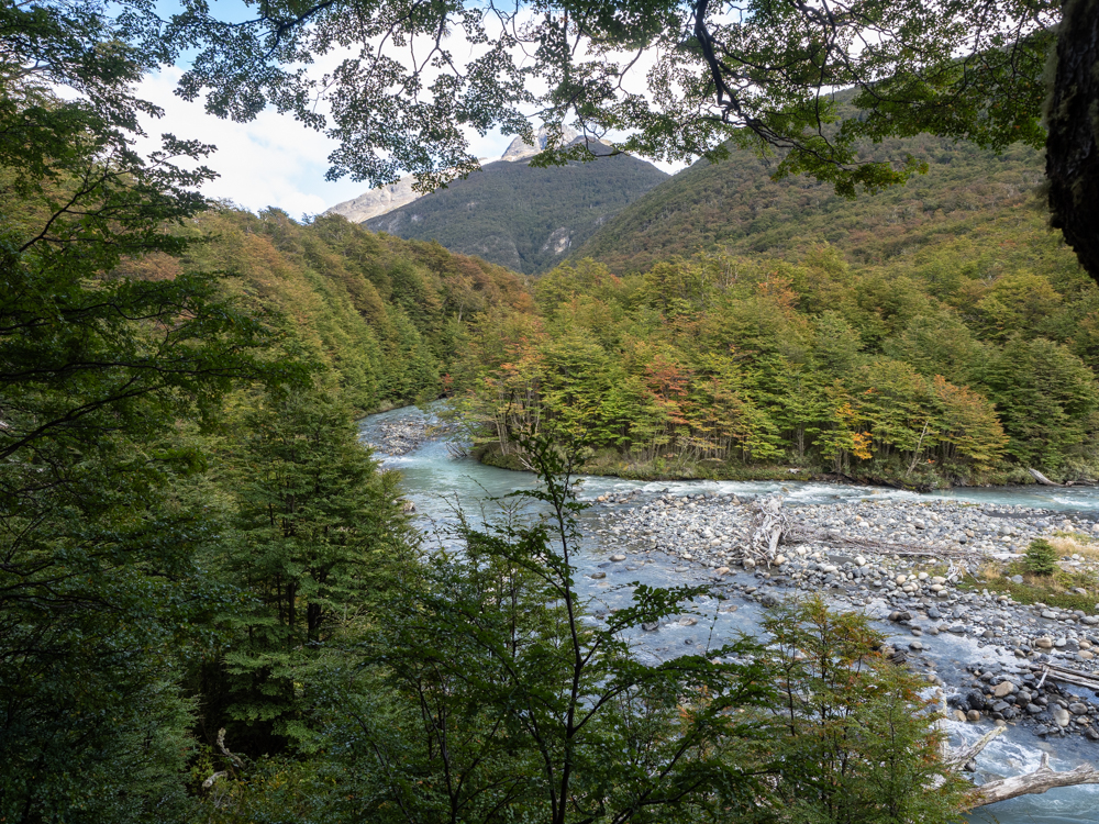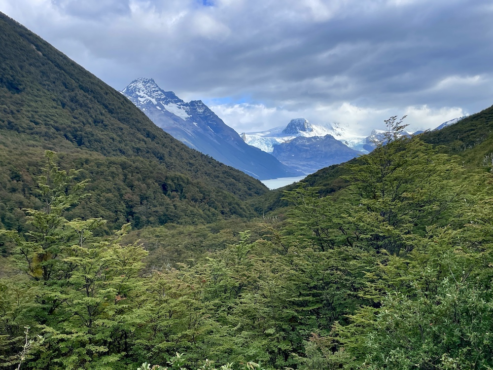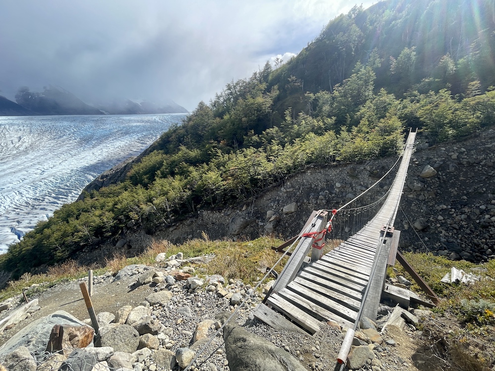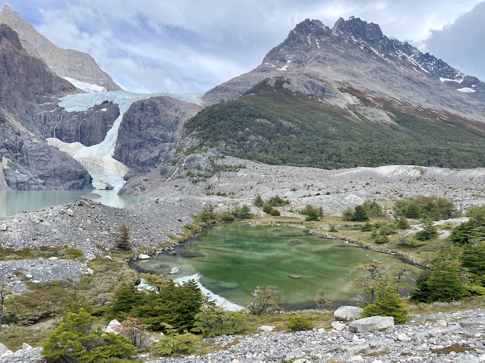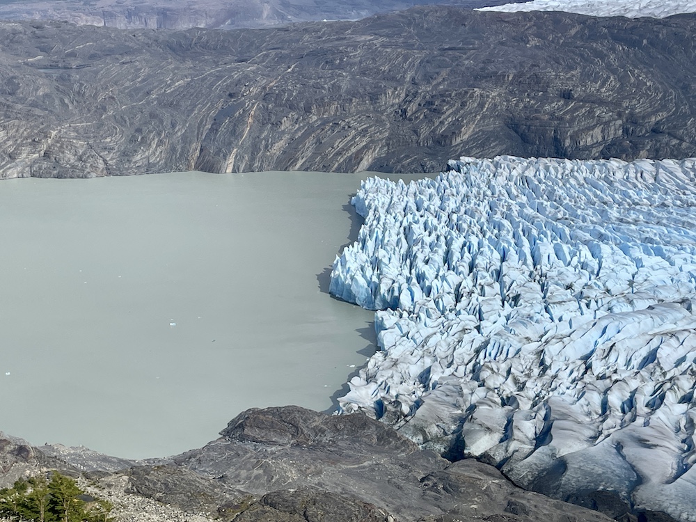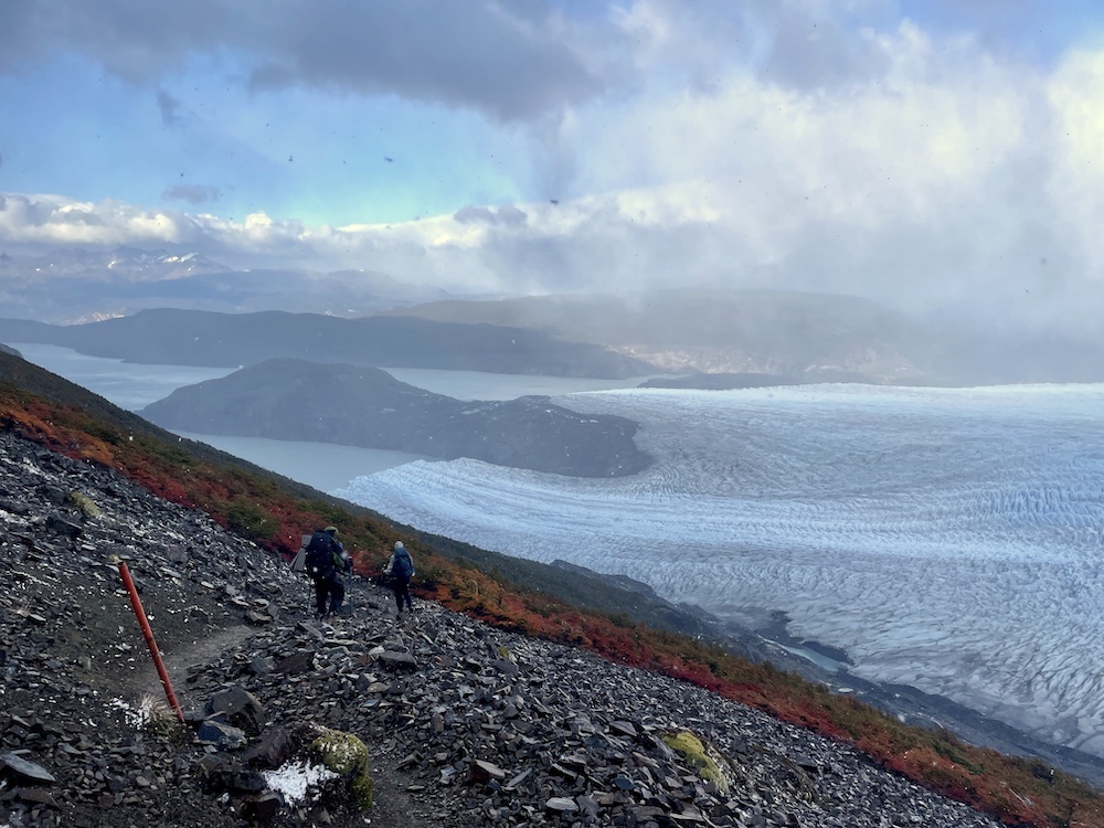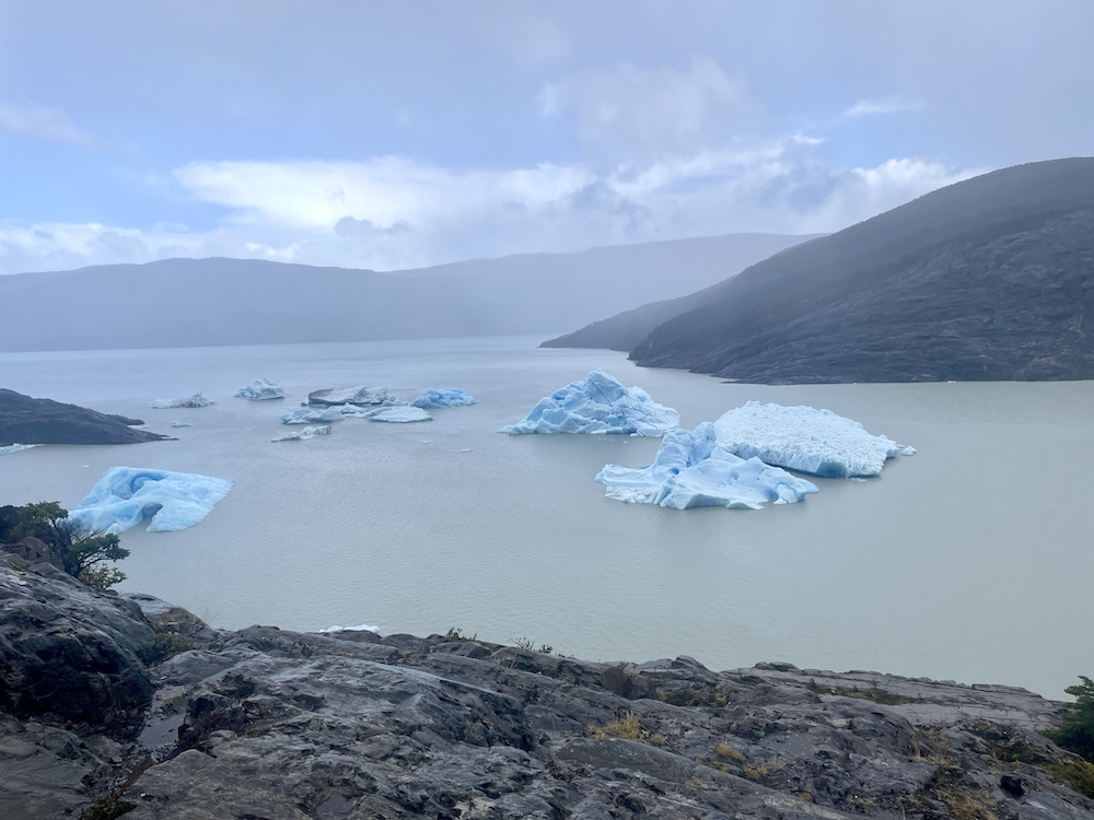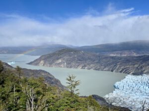 Bald kommen wir wieder in ein Waldstück, und nachdem wir einige andere Gruppen überholt haben, die hier Pause machen, finden auch wir ein geschütztes Plätzchen für eine Pause. Zwar ist das Snickers komplett gefroren, doch es tut trotzdem gut. Nach einer weiteren Stunde wird der Weg flacher und bald erreichen wir die Paso-Rangerstation. Hier machen wir Mittagspause. Der Nachmittag zieht sich dann etwas. Zwar ist der Weg nun im Vergleich zum Vormittag deutlich besser zu gehen, doch jedes kleine Auf und Ab ist mit den Höhenmetern in den Beinen anstrengend. Wir laufen parallel zum Grey-Gletscher entlang der Bergflanke. Dann kommen wir an dem Punkt vorbei, wo der Gletscher in den Lago Grey mündet. Große Eisblöcke treiben hier umher. Mittlerweile zeigt sich auch die Sonne immer öfter und die Aussicht mit blauem Himmel, Regenbogen, Gletscher und Gletschersee ist kaum auszuhalten.