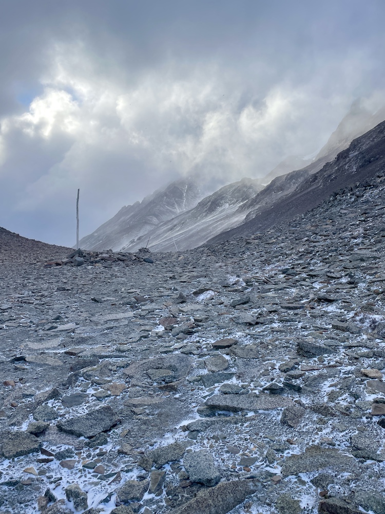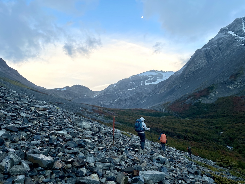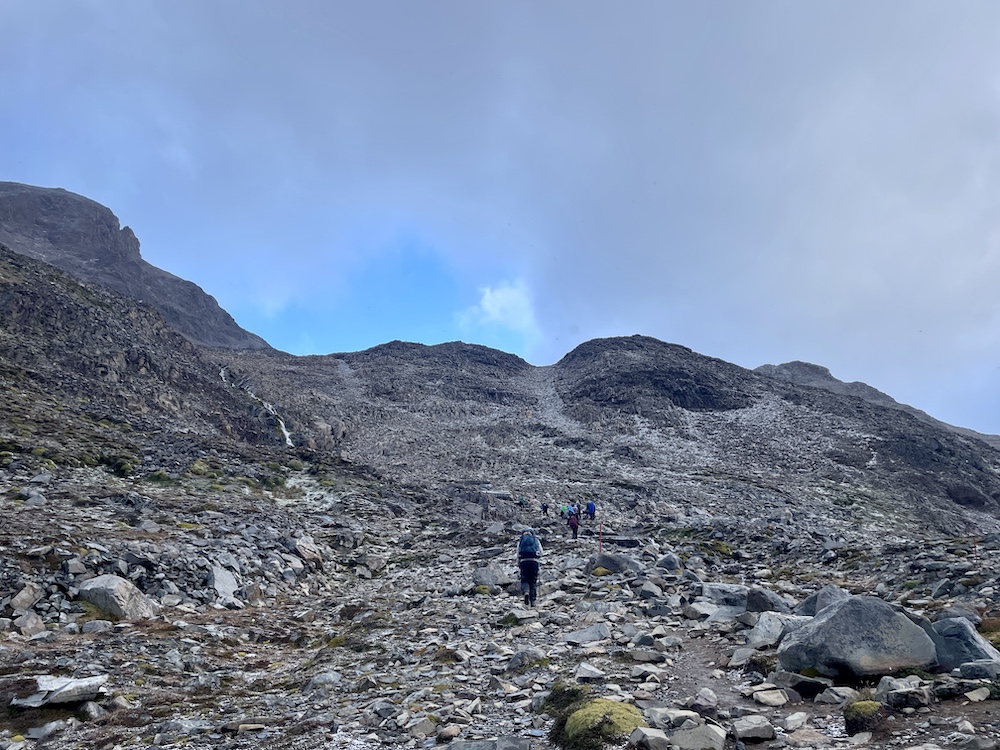 Um 5:30 Uhr klingelt der Wecker. Um 7 Uhr müssen wir das Camp verlassen, um rechtzeitig auf dem Trail zu sein. Zwar ist es noch stockduster, doch im Camp herrscht so früh morgens schon reges Treiben, wenn auch die meisten Gesichter, in die man blickt, noch recht müde aussehen. In Kolonne geht es dann los durch den Wald stetig bergauf. Es regnet, und der Waldboden ist dementsprechend matschig. Im Schein der Taschenlampen versuchen wir, sichere Tritte auszumachen, die weder zu matschig sind noch über rutschige Wurzeln führen. Nach etwa einer halben Stunde verlassen wir den schützenden Wald und stehen auf einmal im Starkwind auf dem offenen Geröllfeld. Direkt bläst es uns die Regencover der Rucksäcke weg. Wir entscheiden, sie besser wegzupacken. Mittlerweile ist die Kolonne etwas aufgebrochen und wir können in unserem eigenen Tempo gehen. Immer mal wieder kommen wir in ein schützendes Waldstück, doch je weiter wir uns hocharbeiten, desto weniger wird der Wald. Bald lassen wir das letzte Waldstückchen hinter uns. Über uns fegen die Nebelschwaden hinweg. Manchmal bricht die Wolkendecke etwas auf, und wir können vor uns den Pass erahnen und hinter uns die Sonne aufgehen sehen. Zumindest dieser Ausblick im Morgenlicht entschädigt für den beschwerlichen Aufstieg. Schritt für Schritt geht es weiter. Die stärksten Böen harren wir in einer möglichst windschnittigen Position aus. Zum Glück haben wir alle unsere Wanderstöcke dabei, denn ohne den extra Support wäre es schwierig geworden. Der Regen wird irgendwann zu Schnee und peitscht uns unentwegt ins Gesicht. Einmal halten wir an, um uns Handschuhe anzuziehen, ansonsten laufen wir ohne Pause weiter. Am Ende wird es nochmal steil, dann wird das Gelände ebener und nach 2,5 Stunden überqueren wir den höchsten Punkt des John-Gardener-Passes. Hier ist der Wind am stärksten, denn er wird durch eine Schneise aus Felswänden gepresst. Wir stehen im Kreis und klammern uns aneinander fest. Wir können im Starkwind keinen Schritt mehr gehen. Wir warten, bis die stärksten Böen durchgezogen sind, dann tasten wir uns wieder ein paar Schritte vor. Es geht relativ steil bergab, und je weiter wir uns vom Pass entfernen, desto schwächer wird auch der Wind. Jetzt können wir auch zum ersten Mal die Aussicht richtig genießen, die sich unter uns bietet. Denn wir stehen direkt oberhalb des Grey-Gletschers und blicken auf endlose Massen an Eis und Schnee.